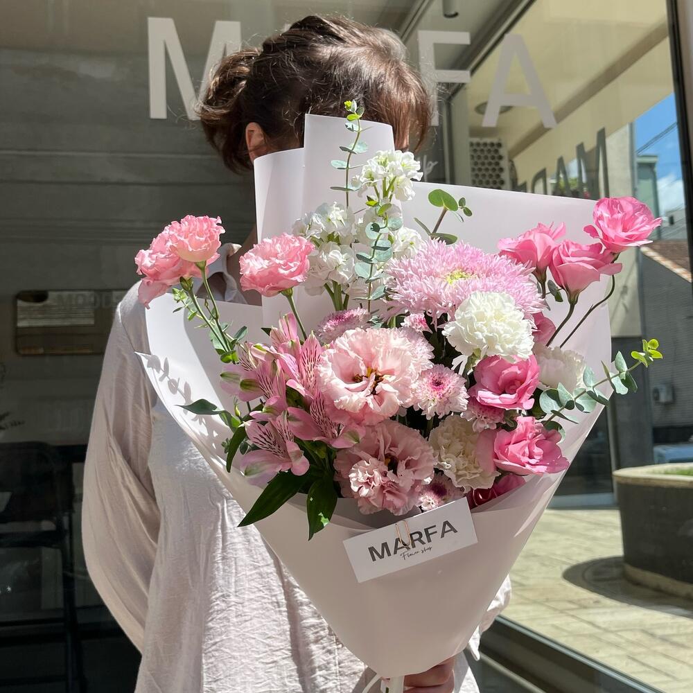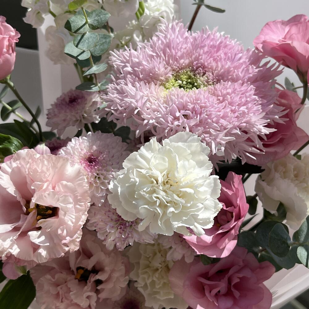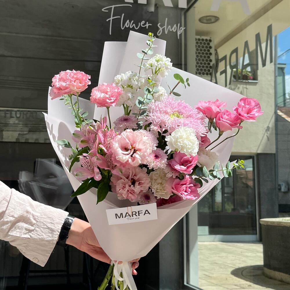 Eustoma - 2 db. eukaliptusz - 3 db. Krizantém - 1 db. Alstroemeria - 1 db. szegfű - 3 db. mattiola - 2 db. chrysanthemum spray - 1 db.
