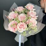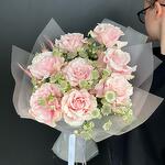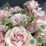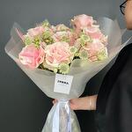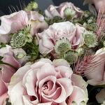 Szalag - 1 db. rózsa - 9 db. csomagolás - 1 db. scabiosa - 7 db.