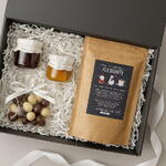 Gift set in a stylish black box with a white ribbon: aromatic A’la Bounty coffee, two handmade mini jams, and a selection of chocolate-covered nuts. A perfect surprise for those who appreciate delicious and beautiful gifts. Zestaw prezentowy w eleganckim czarnym pudełku z białą wstążką: aromatyczna kawa A’la Bounty, dwa ręcznie robione mini dżemy oraz orzechy w czekoladzie. Idealna niespodzianka dla miłośników smacznych i pięknych prezentów.