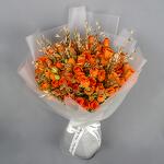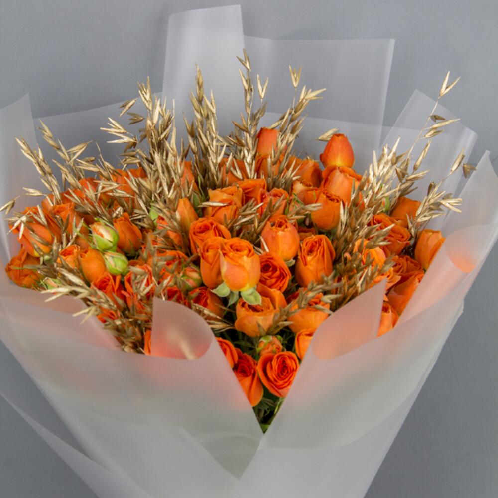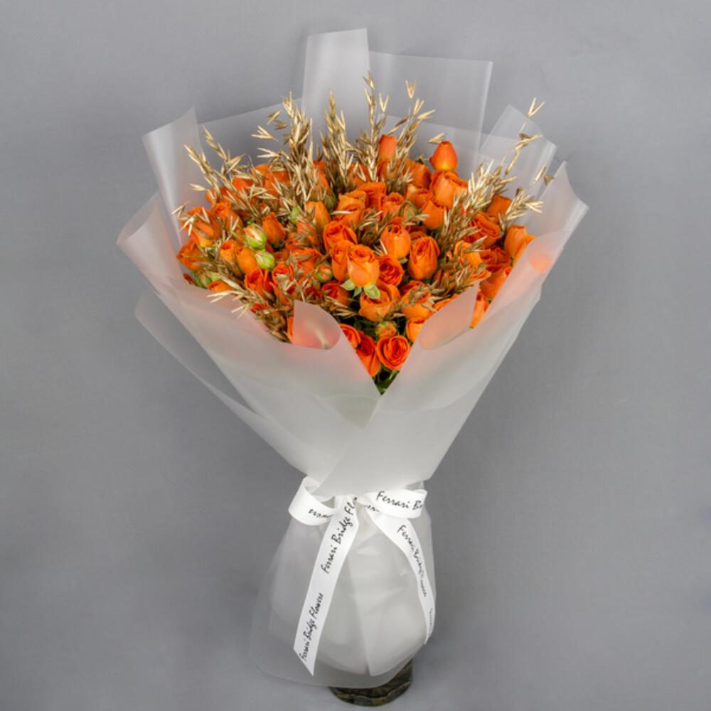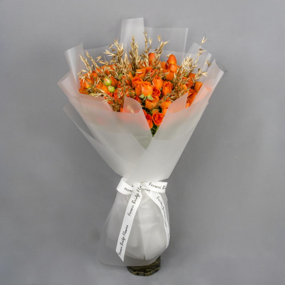 A hand bouquet of orange spray roses with golden dry heat