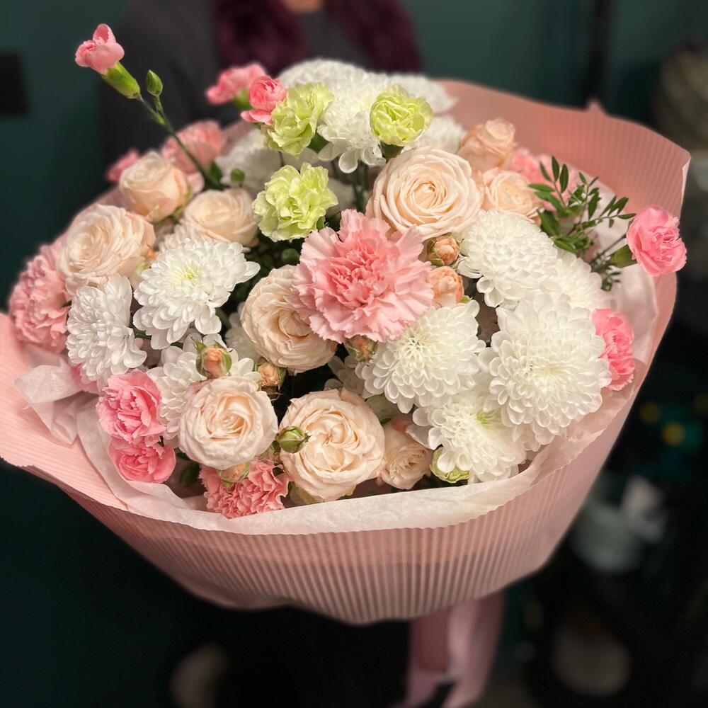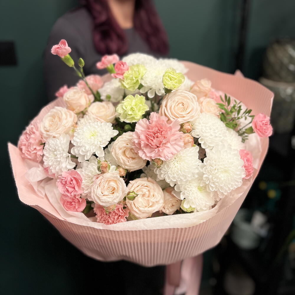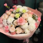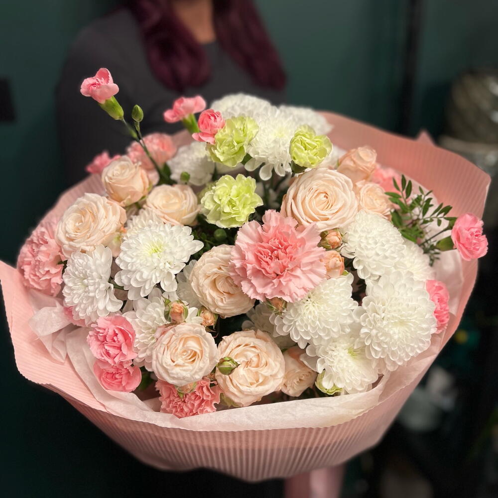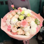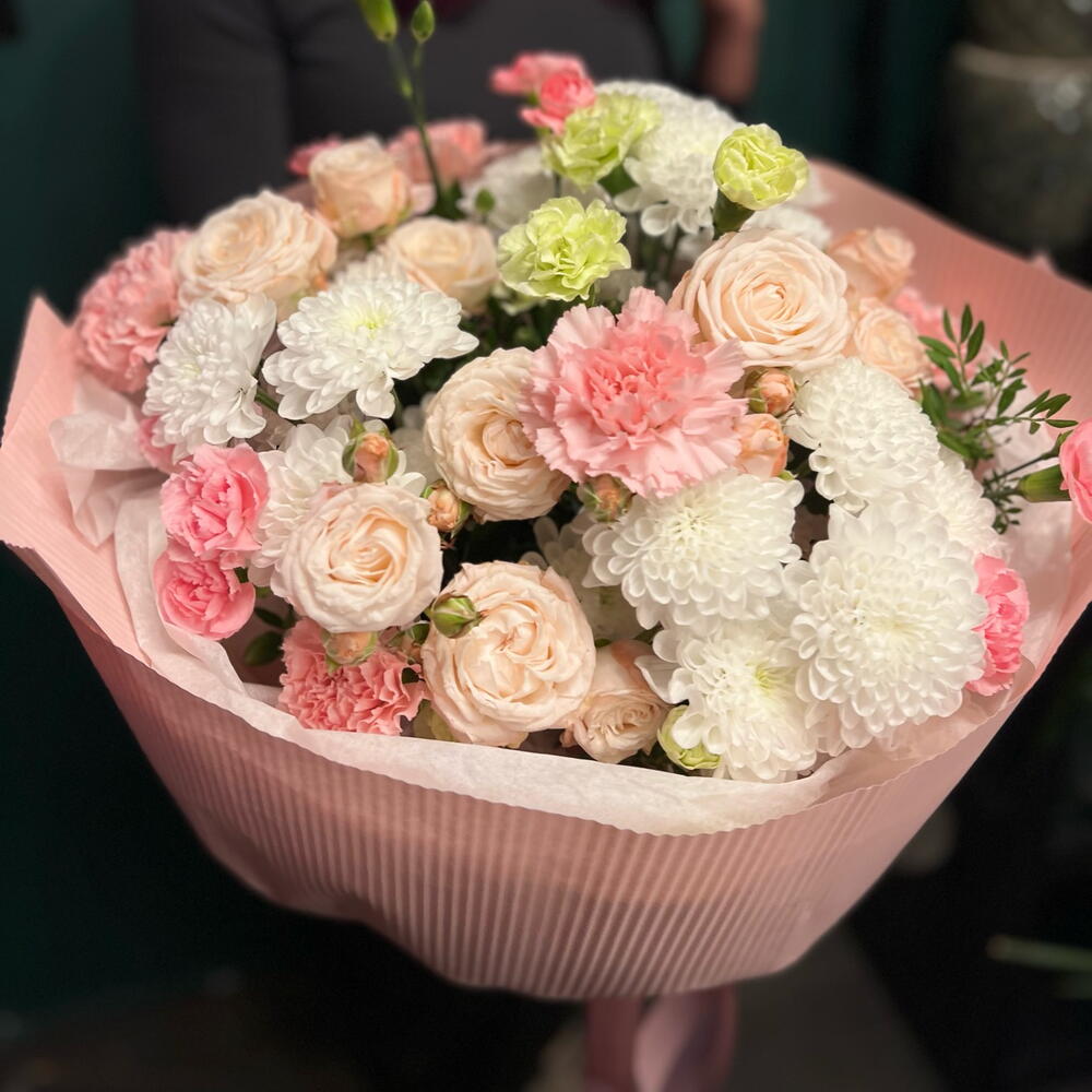 Fehér krizantém - 3 db. szegfű - 5 db. spray rózsa - 3 db. szegfű gólązkowy - 5 db.