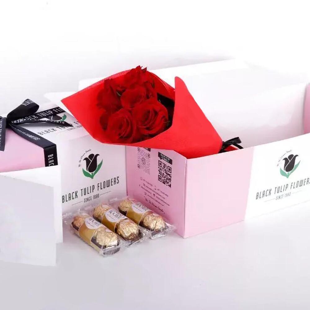 Piros rózsa - 6 db. ferreo rocher - 3 db. pink box (l40cm x w17cm x h14cm) - 1 db.