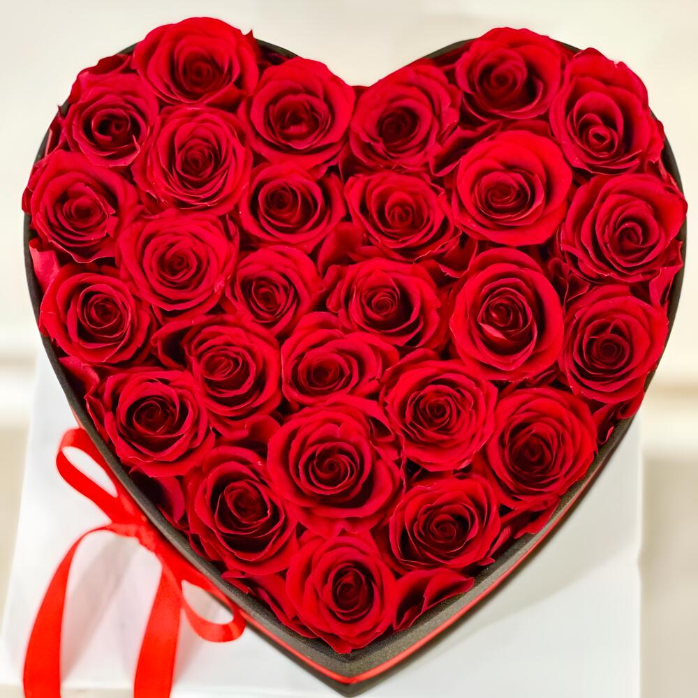 Szív alakú doboz 27 tartósított vörös rózsával — valódi rózsák, amelyeket gondosan kezelték, hogy hónapokig vagy akár évekig megőrizzék friss megjelenésüket. Ezek az örök virágok tökéletesek az időtlen szerelem, a szenvedély és az elegancia kifejezésére. Nem igényelnek öntözést vagy gondozást — csak tartós szépséget.