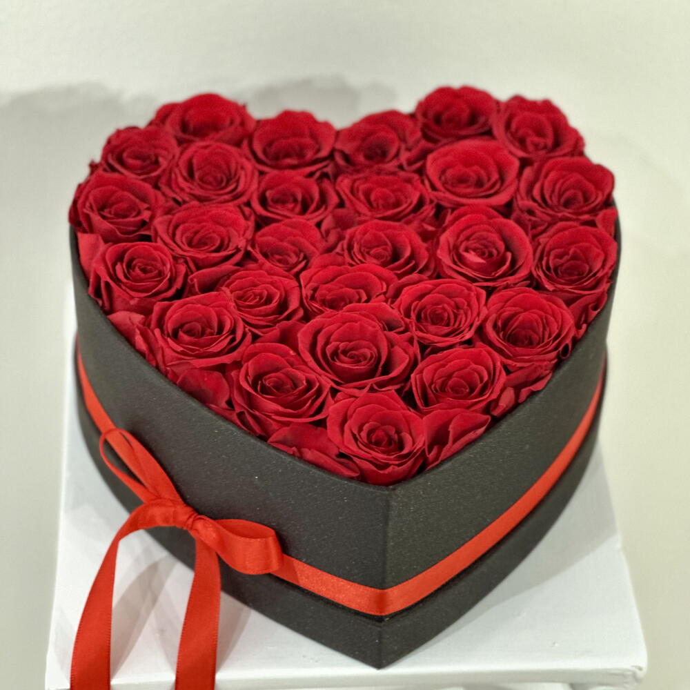 szív alakú doboz - 1 db. 27 tartósított rózsa - 27 db.