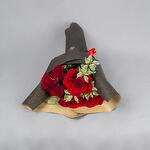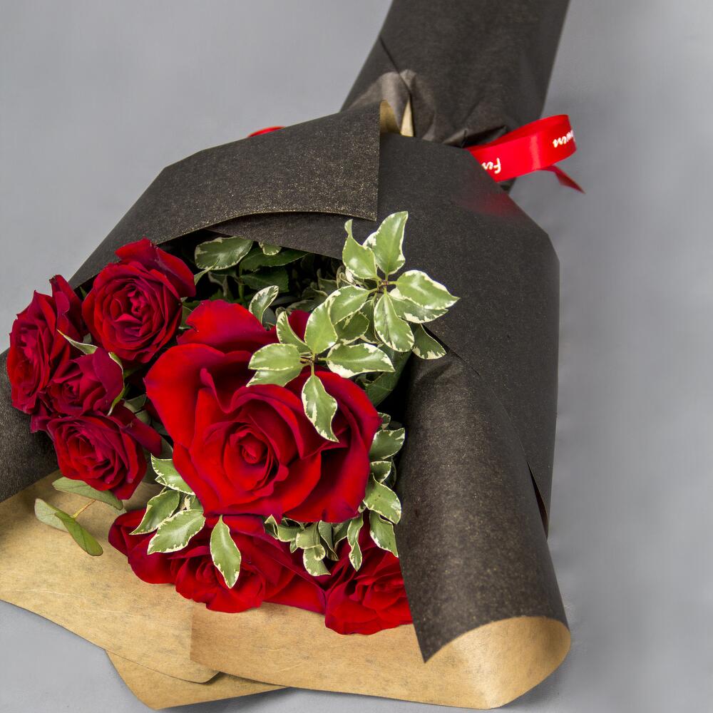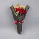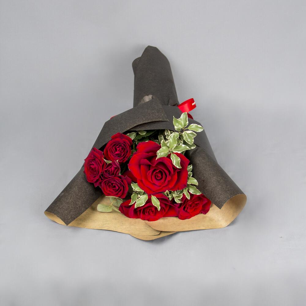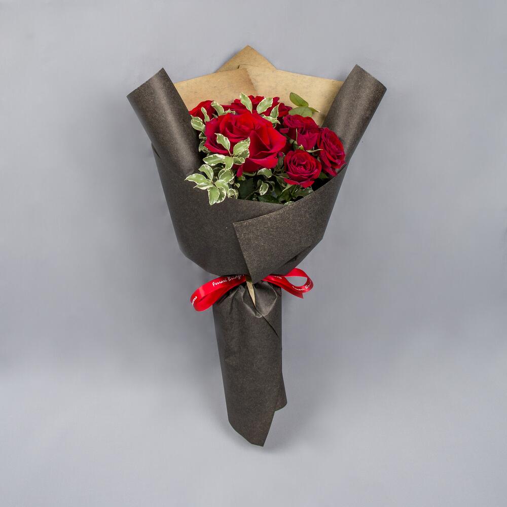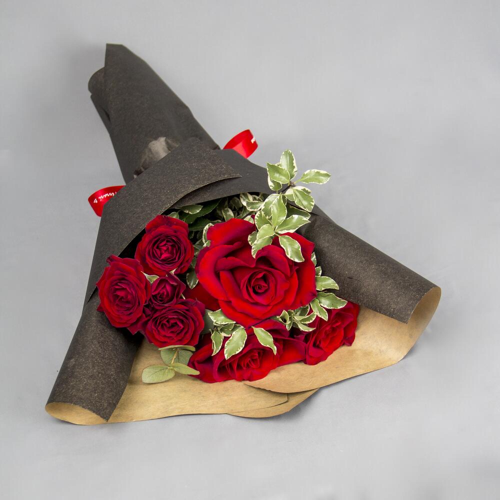 A hand bouquet of red roses and spray roses wrapped with black wrapping