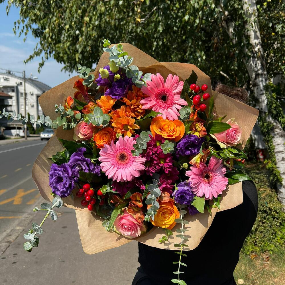 Krizantém - 2 db. Alstroemeria - 3 db. Lisianthus - 2 db. hippericum - 2 db. eukaliptuszlevelek - 8 db. gerber - 3 db. hedera leaves - 5 db. paper wraping - 1 db. roses orange and pink - 6 db.