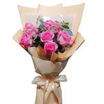 Nice pink bouquet arranged with pink roses, limonium and eucalyptus
