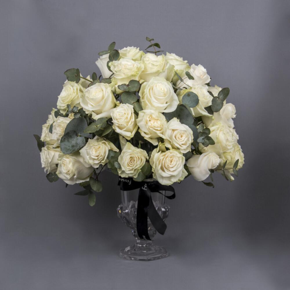 Szalag - 1 db. eukaliptusz - 3 db. rózsa - 40 db. crystal glass vase - 1 db.