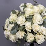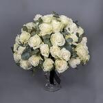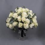 A beautiful vase arrangement with white Roses and Eucalyptus leaves in a classic glass vase.
