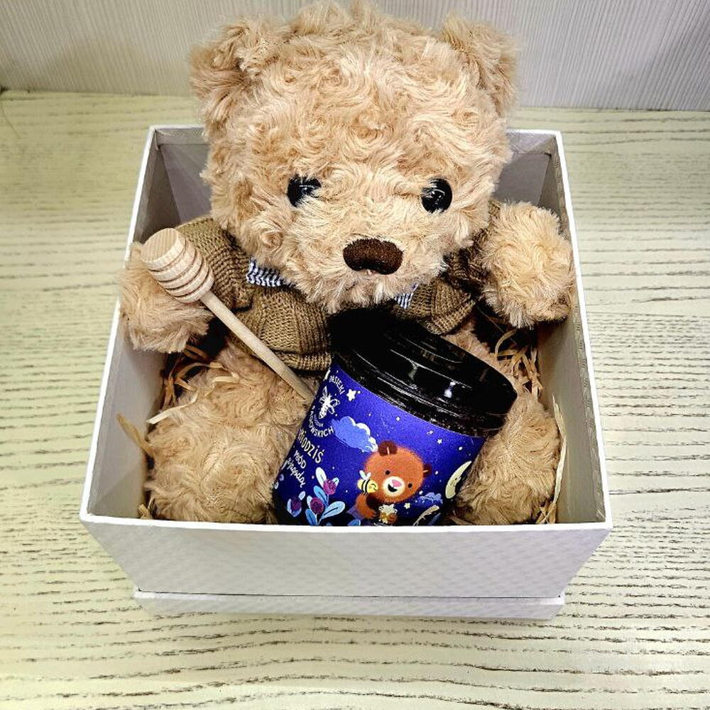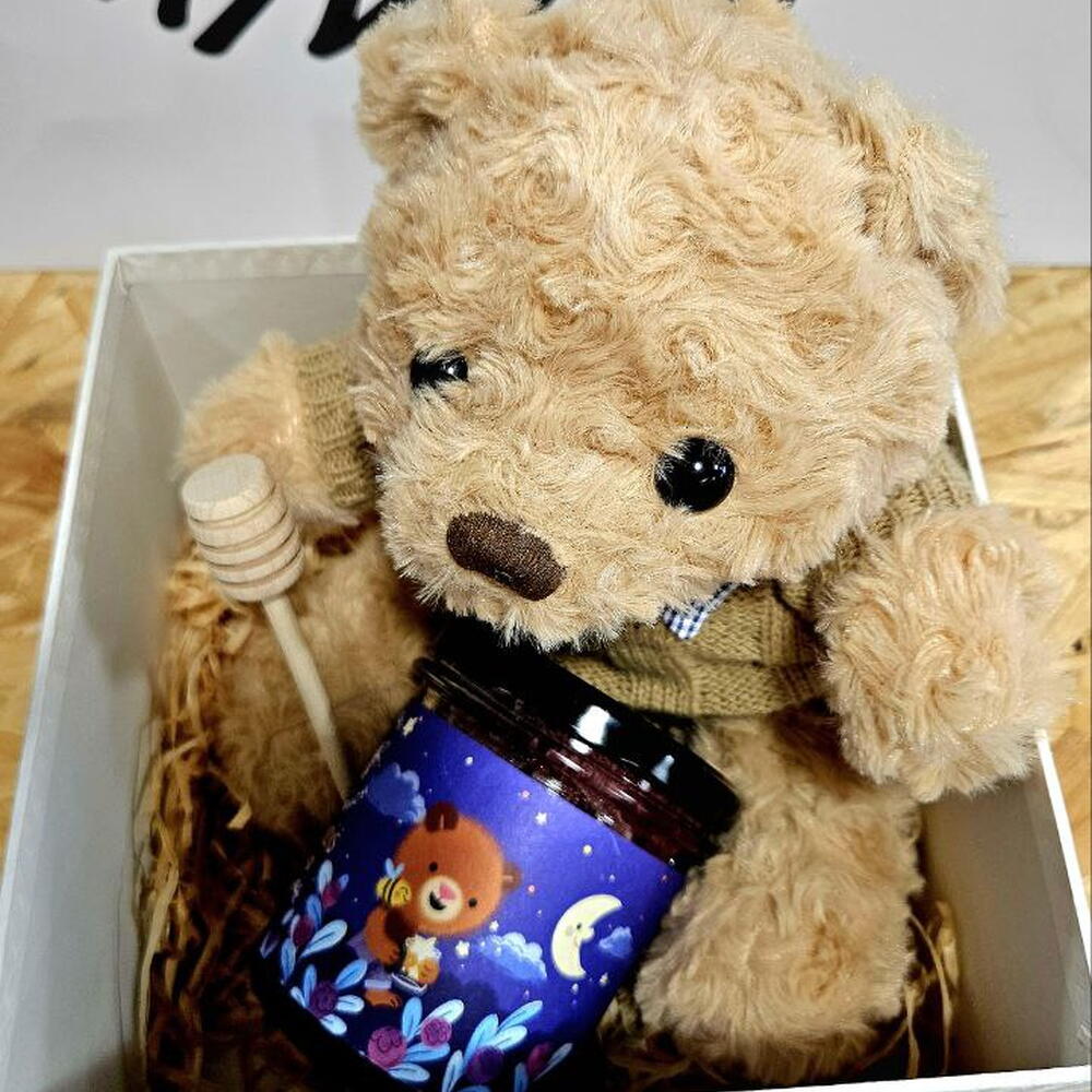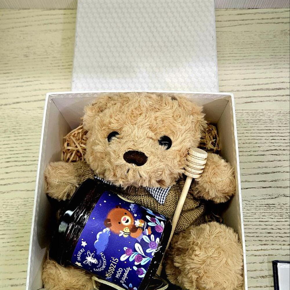 Uroczy zestaw prezentowy w eleganckim pudełku, w którym znajduje się miękki pluszowy miś ubrany w beżowy sweterek. Miś trzyma drewnianą pałeczkę do miodu, a obok niego umieszczony jest słoiczek miodu o pięknej kolorowej etykiecie z ilustracją misia. Całość została wyłożona dekoracyjną trawą, co nadaje prezentowi ciepły i przytulny charakter. Misio kocha dzieci jak nikt i uczy je miłości do przyrody, zwierząt, a nade wszystko zaraża je miłością do miodku, który, jak każdy bajkowy miś, bardzo kocha i jak nikt potrafi przemycić go nawet największym niejadkom. Miodziś Miód z jagodą to w 100% naturalne połączenie miodu wielokwiatowego z liofilizowanymi jagodami. Urozmaici kanapki, tosty, osłodzi gofry. Jest idealny do porannej owsianki, naleśników i omletów. Na śniadanie, podwieczorek i kolacje. Z jagodowym Miodzisiem przygotujecie również wyśmienite lemoniady. Miś jest bardzo mięciutki, ubrany w sweterek z naturalnych nici, który można zdejmować i zakładać