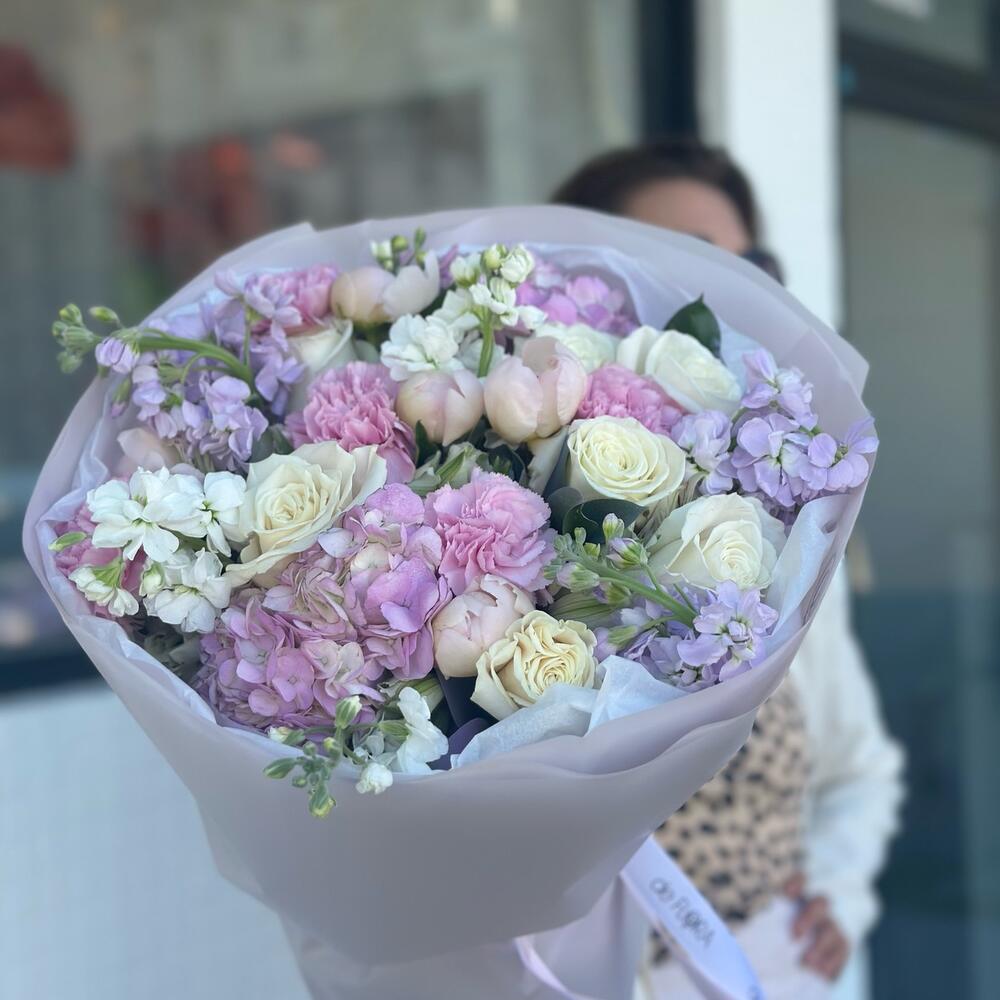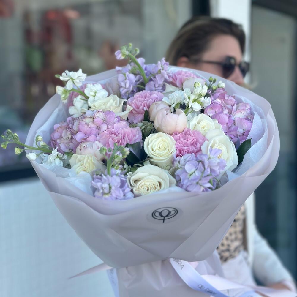 Csodabogyó - 5 db. szegfű rózsaszín - 5 db. alstroemériák - 3 db. készlet - 7 db. fehér rózsák - 7 db. lila hortenziák - 2 db.