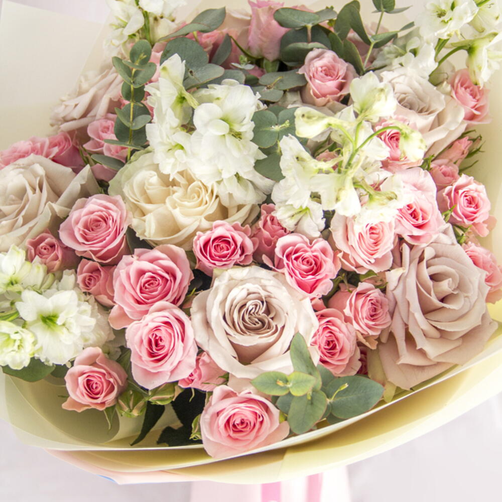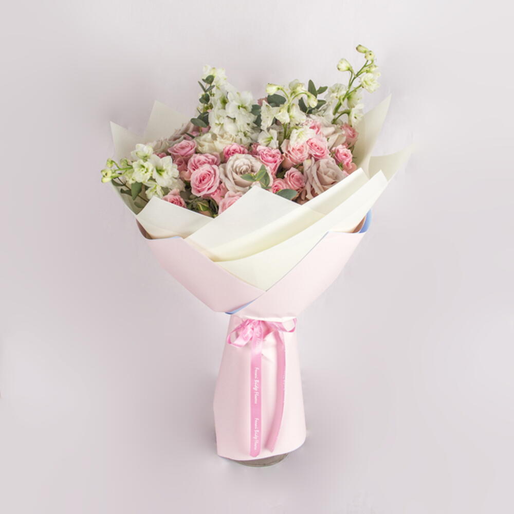 A delicate mix of pink and cream roses and elegant blooms, wrapped in soft pastel paper. Perfect for any occasion.
