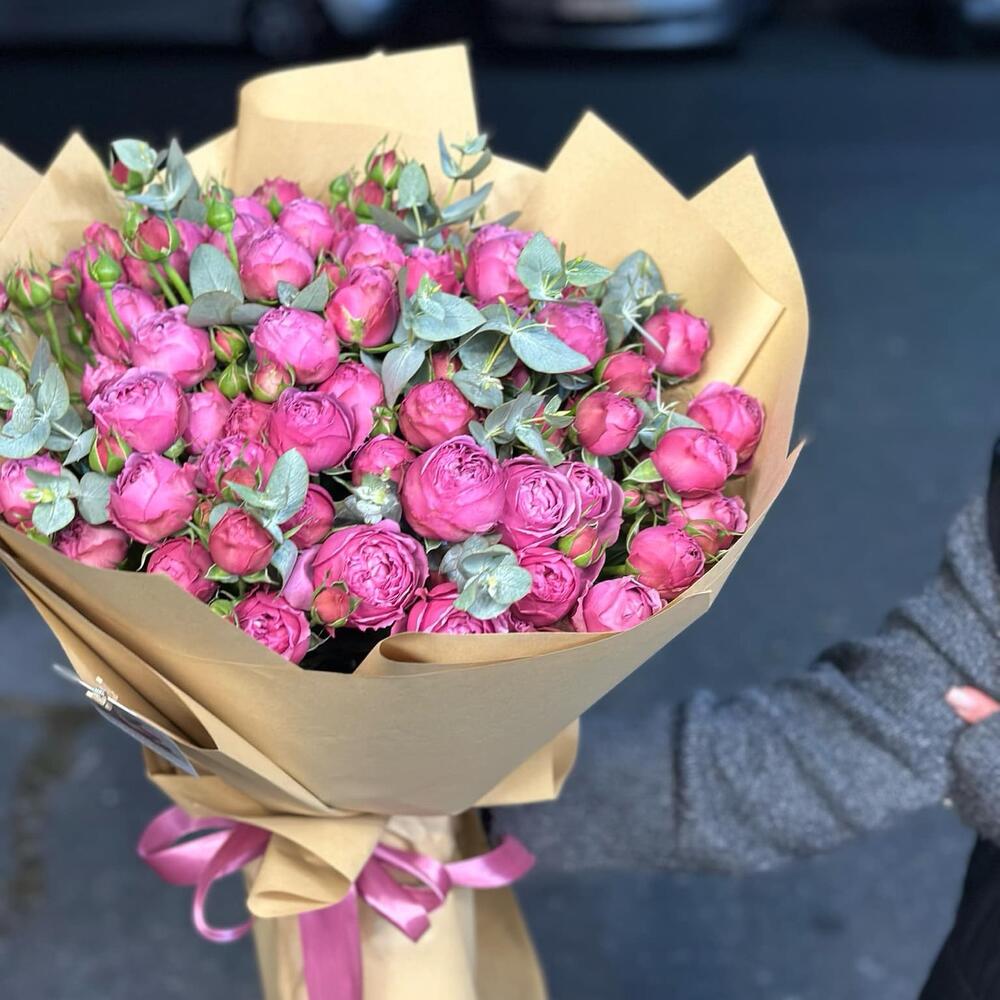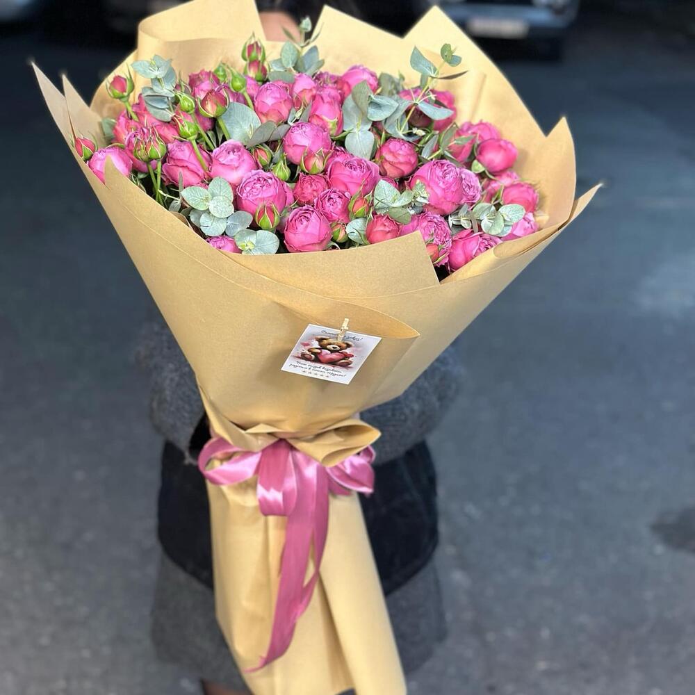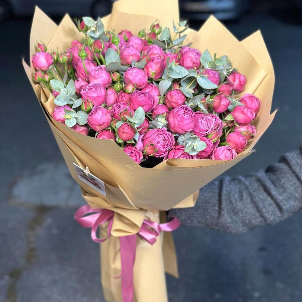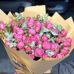 Яркий букет из миниатюрных роз насыщенного розового цвета. Эти розы символизируют страсть, нежность и романтику, что делает букет идеальным подарком для любимого человека. Украшен зеленью и оформлен в стильную крафтовую упаковку, которая подчёркивает естественность и элегантность композиции. Завершает образ роскошная атласная лента, добавляя изысканности и шарма. Этот букет станет прекрасным способом выразить свои чувства и подарить радость.” Характеристики: • Цветы: розовые мини-розы • Цветовая гамма: розовый, зелёный • Оформление: крафтовая упаковка с атласной лентой