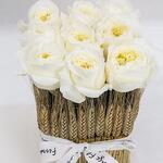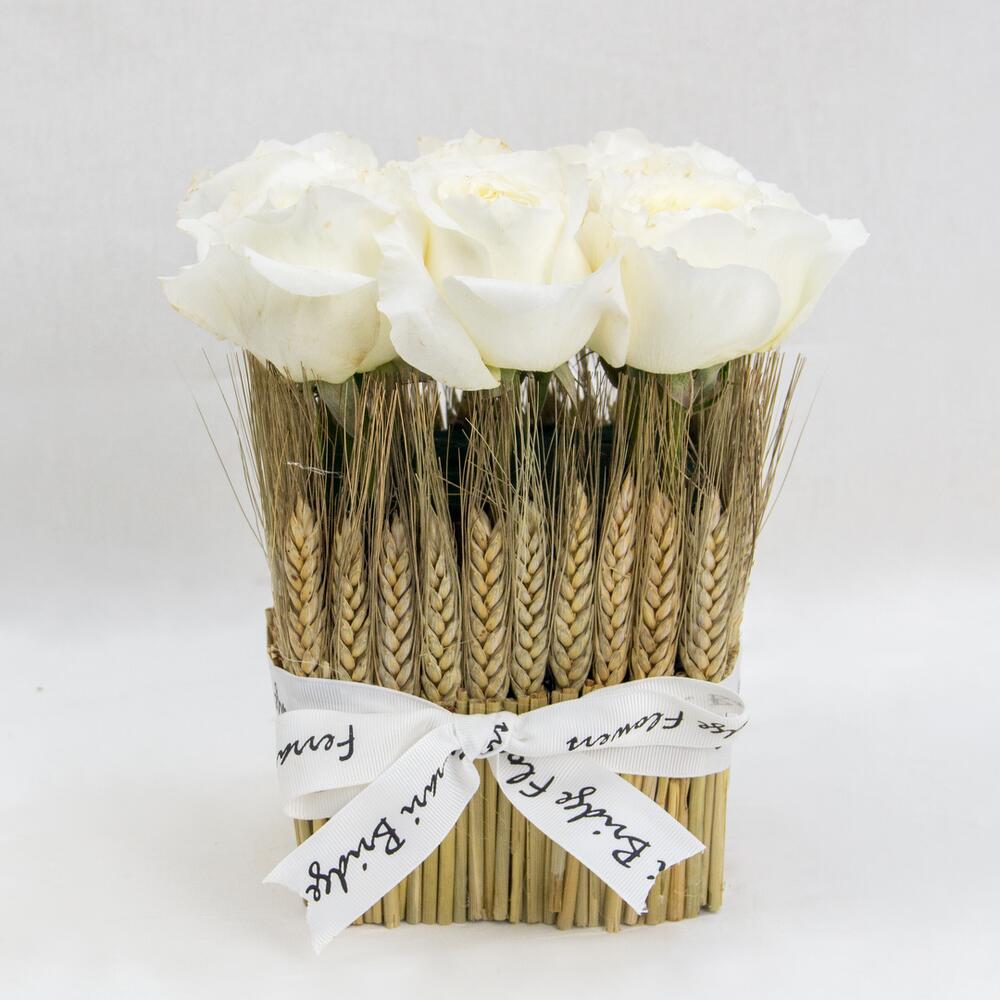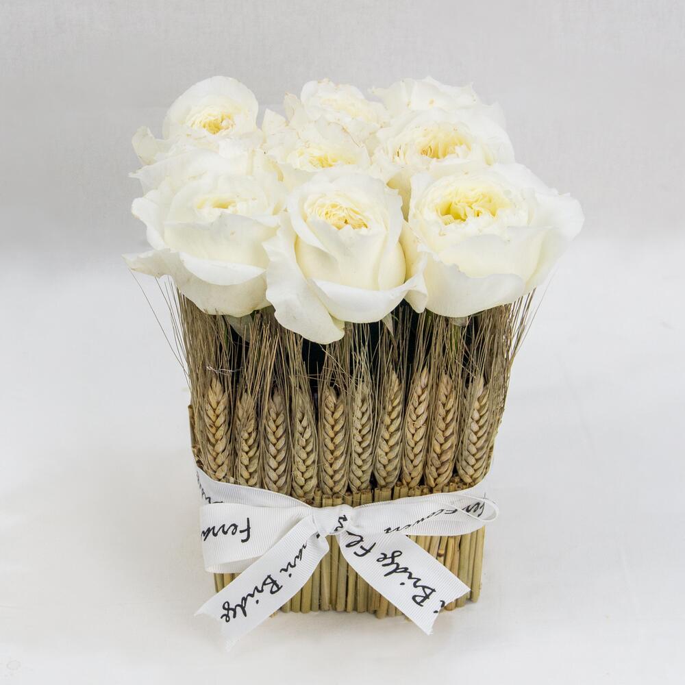 Szalag - 1 db. Fehér rózsa - 9 db. floral foam - 1 db. square glass vase - 1 db. dry wheat bunches - 1 db.