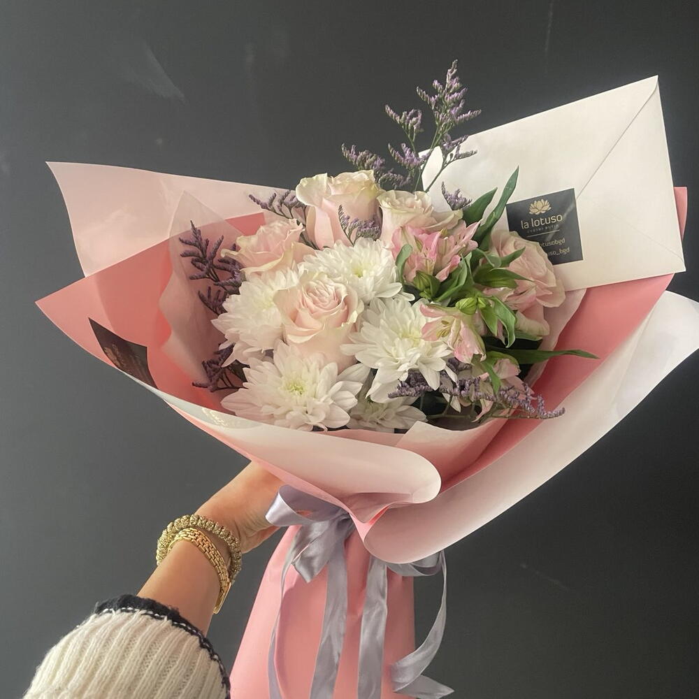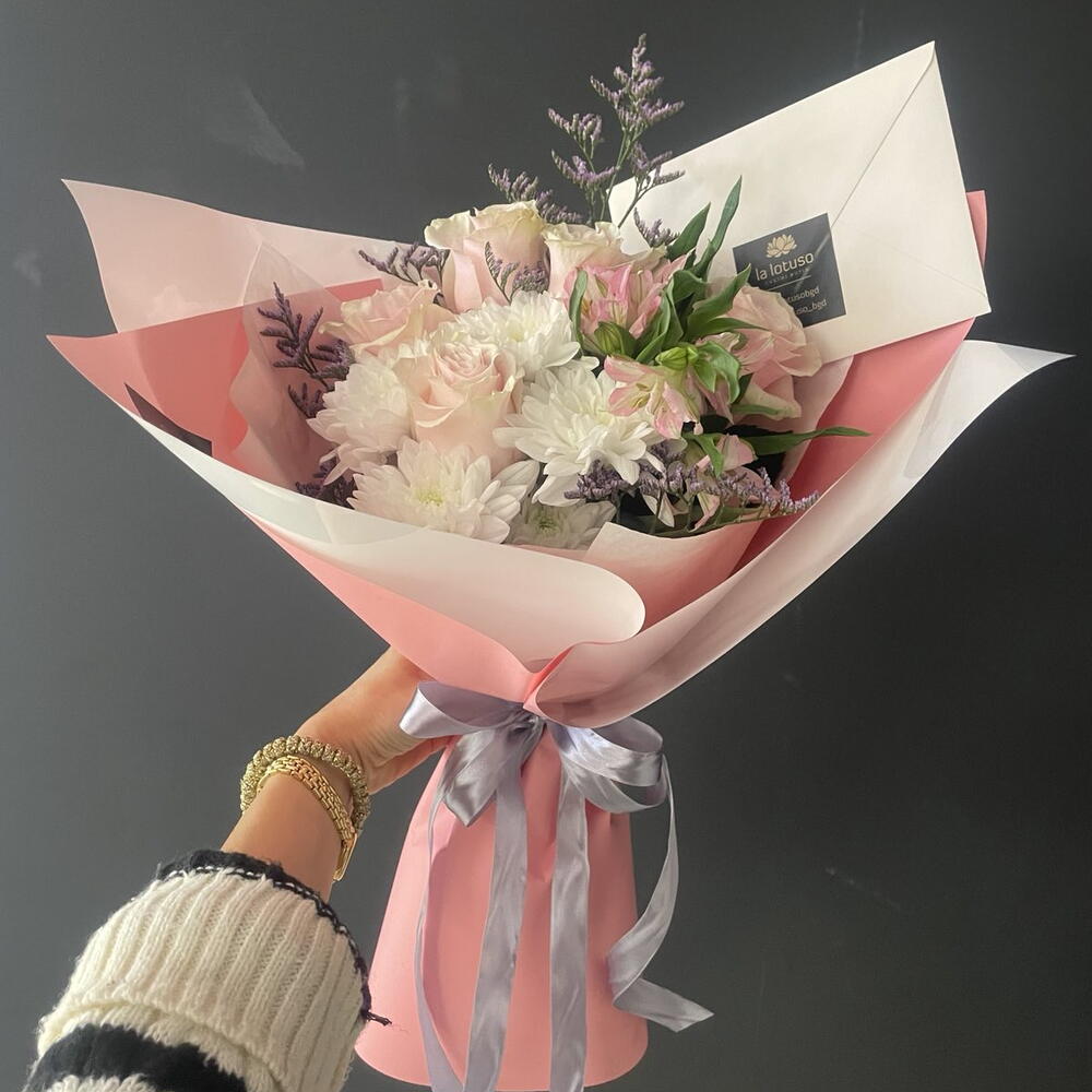 Szatén szalag - 1 db. Limonium - 4 db. Krizantém - 2 db. Lisianthus - 1 db. csomagolópapír - 4 db. ecuador pink rose - 5 db. green mix - 2 db.