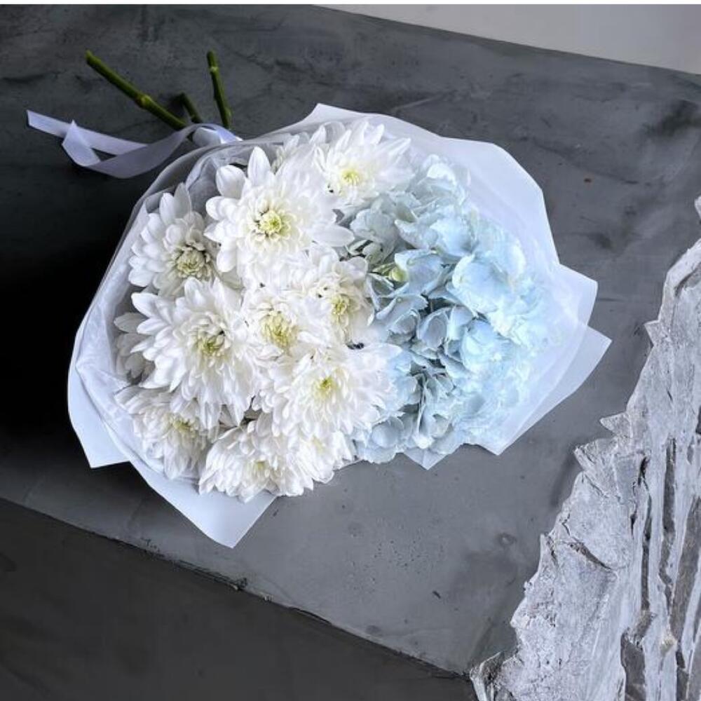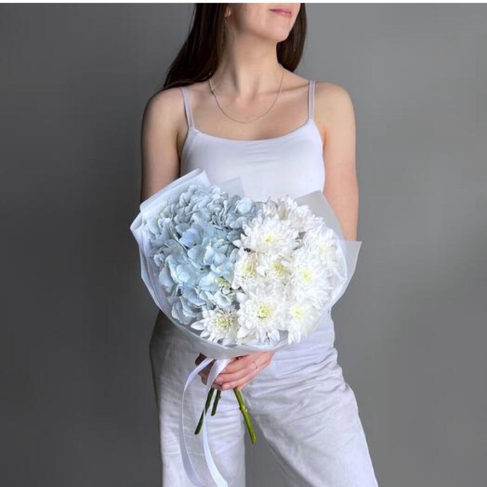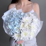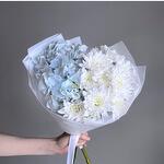 Нежный дуо букет в пастельных тонах с гортензией и хризантемой. Гортензия очень любит воду, не оставляйте ее срез без воды. Для вашего удобства все наши букеты доставляются в воде! Не забудьте подрезать цветы НЕПОСРЕДСТВЕННО перед тем как ставить в вазу (после подрезки в течении 2-3 секунд поставьте в воду). Не храните букет на прямых солнечных лучах и возле отопительных приборов, чтобы сохранить цветы свежими как можно дольше. Обратите внимание на размеры букета и фото в полный рост с человеком, для понимания размера композиции, это фото есть в карточке товара :)