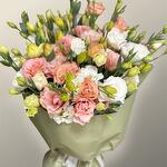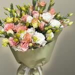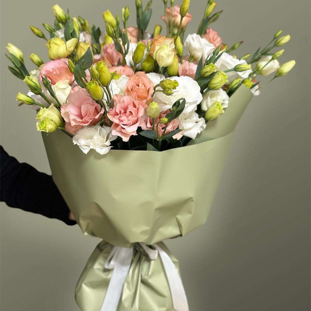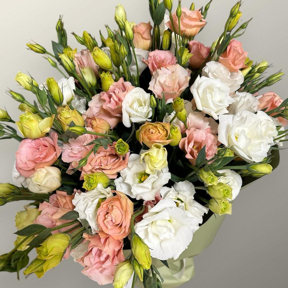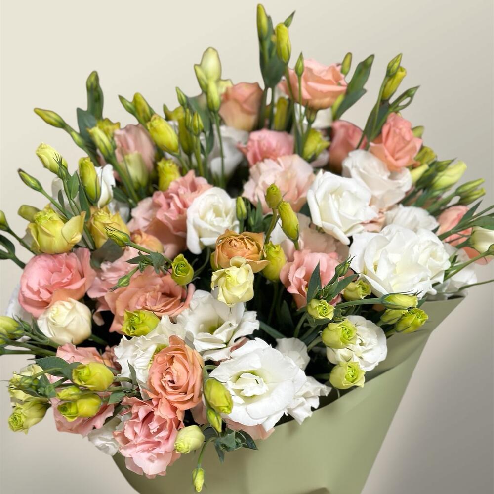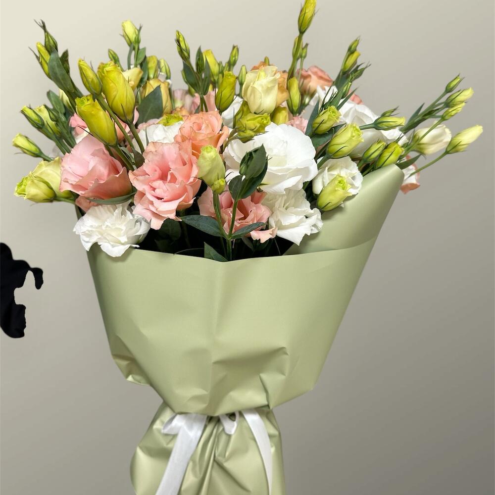 Букет из элегантных эустом в пастельных оттенках розового, кремового и белого, оформленный в стильную матовую упаковку мягкого зелёного цвета. Эустомы символизируют утонченность и нежность, а их бутоны добавляют композиции динамики и воздушности. Прекрасный выбор для романтического жеста или особого повода. Завершен изысканной белой лентой.