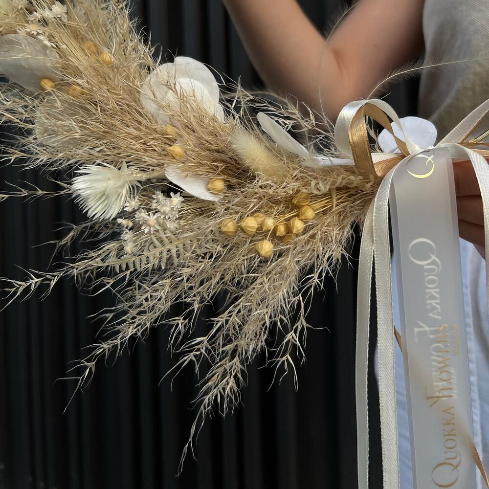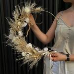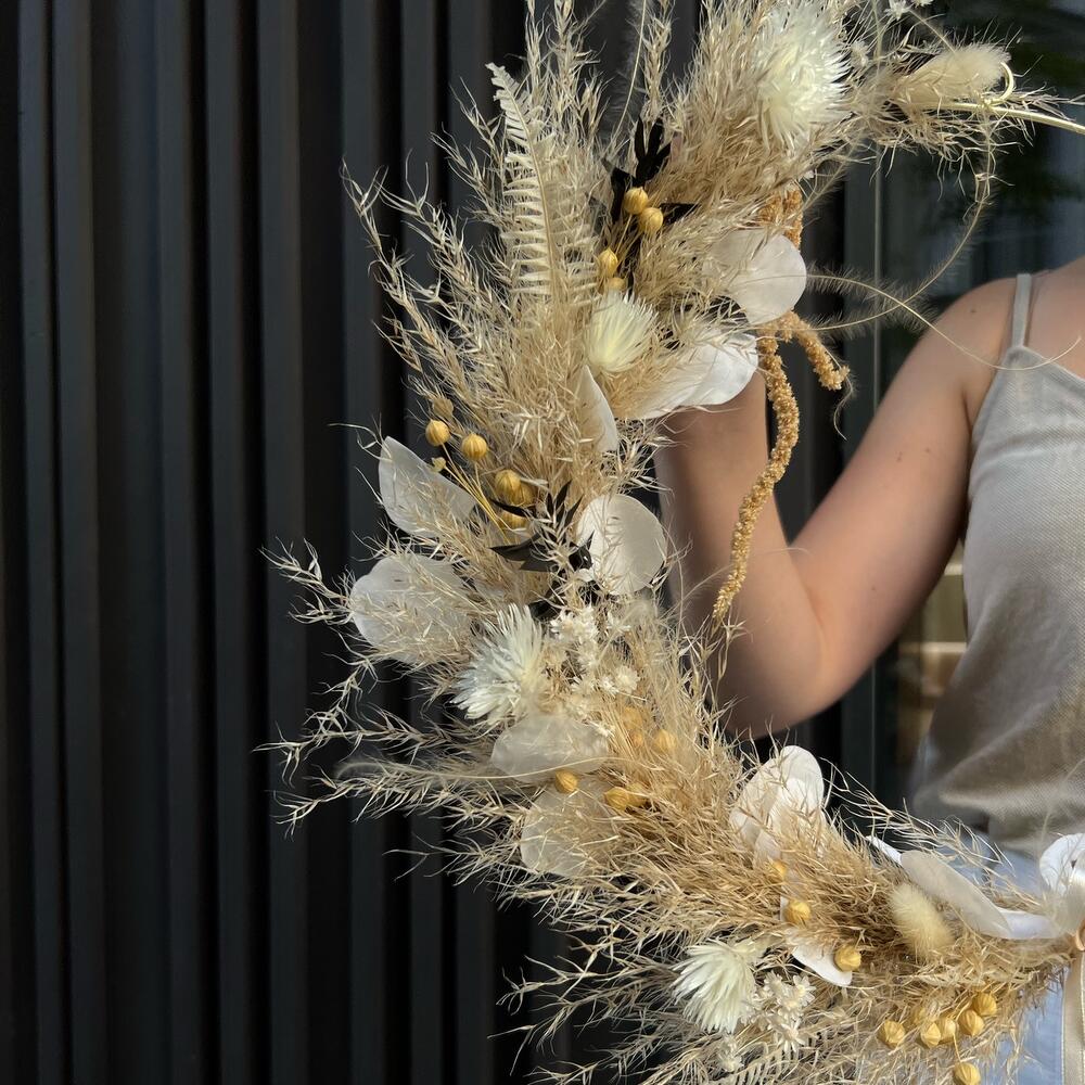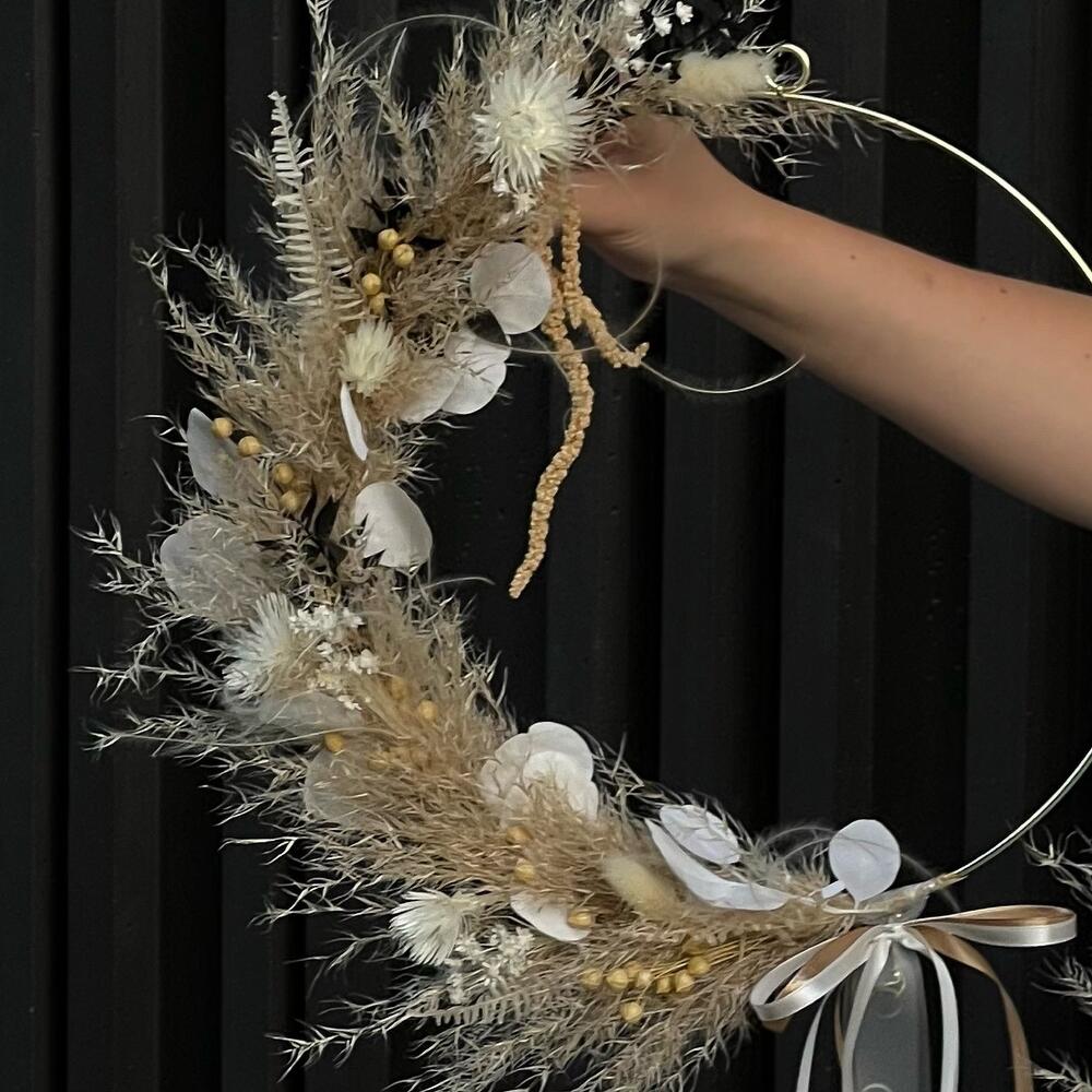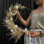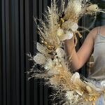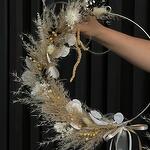 A koszorú dekorációként elegáns kiegészítő, amely természetes szépséget és frissességet hoz bármely belső térbe. Arany karikára készítve ez a koszorú különösen feltűnő és luxus hatású. Az arany karika egy csillogó, rangot sugalló elemet ad, kiemelve a virágkompozíció gazdagságát. A koszorúhoz kiválasztott virágok a legmagasabb minőséget képviselik, gondosan válogatták őket, hogy biztosítsák tartósságukat és élénk színeiket. A színek gazdagsága és a virágformák sokfélesége harmonikus kompozíciót alkot, amely megragadja a tekintetet és különleges karaktert ad bármely térnek. A koszorú falidíszként, ajtódíszként, asztaldíszként vagy stílusos kiegészítőként használható különféle ünnepségeken. A magas minőségű anyagoknak és a gondos kivitelezésnek köszönhetően ez a koszorú nemcsak szép, hanem tartós is, így hosszú ideig örömet fog okozni. Kiváló választás azoknak, akik értékelik az eleganciát, a finomságot és a természetes szépséget.