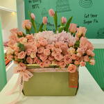 eukaliptusz - 2 db. Hortenzia - 2 db. Rózsaszín rózsa - 9 db. Tulipán - 4 db. baby rose link - 15 db.