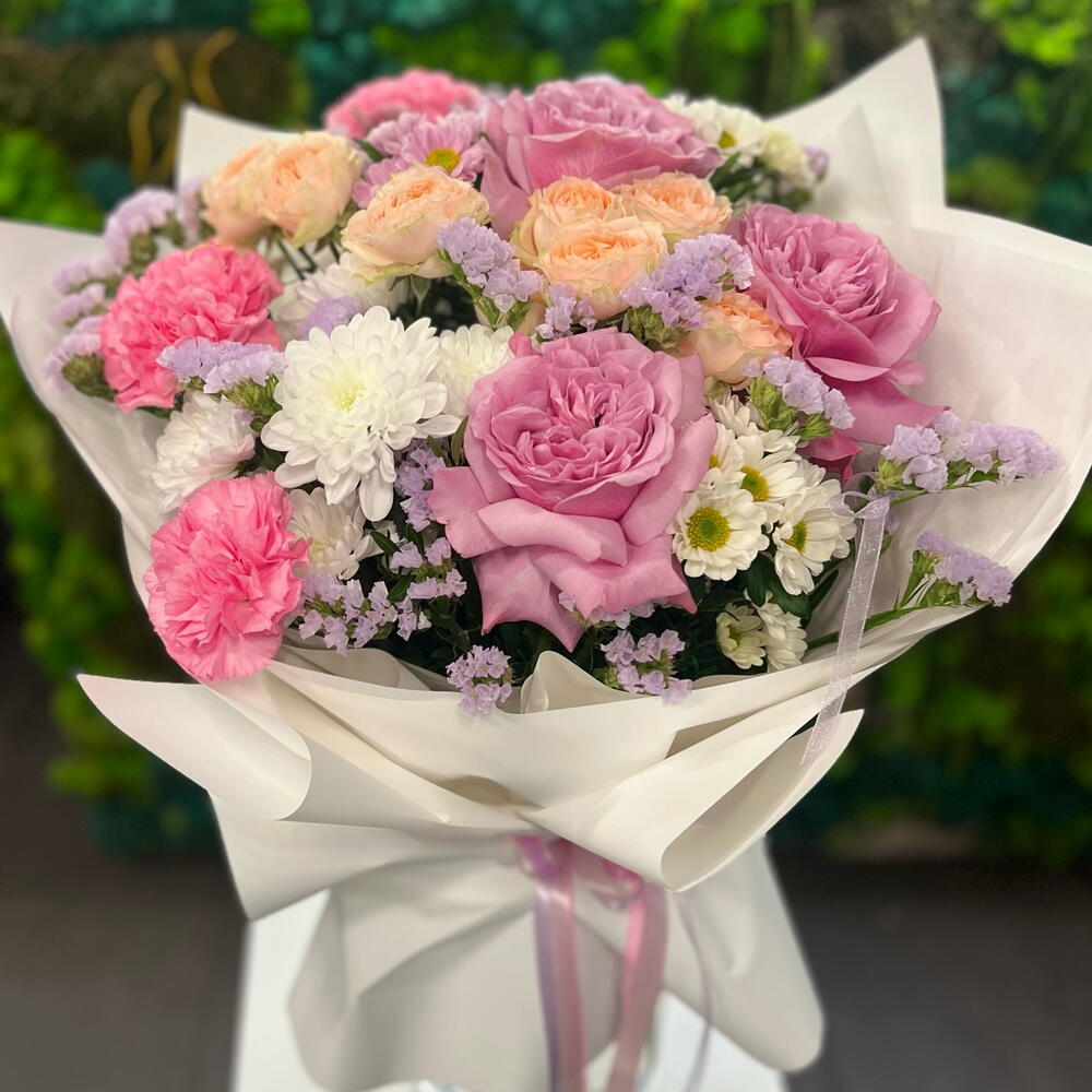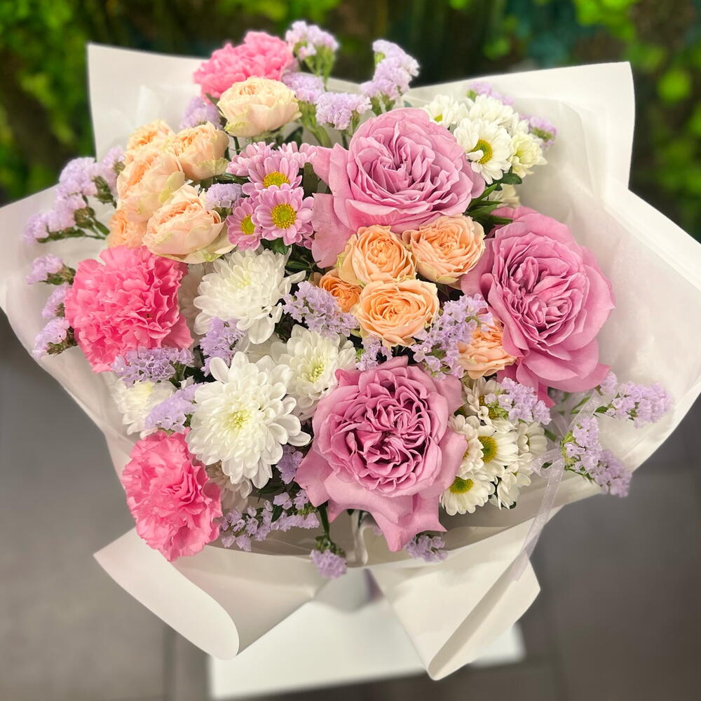Unfortunately, the bouquet we received was significantly smaller than the one shown in the photo at the time of ordering. Several flowers that were visible in the product image were missing. The bouquet had an approximate diameter of about 30 cm, whereas the bouquet in the description and photo appeared to be around 45 cm in diameter.