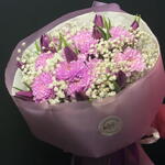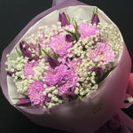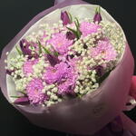 Discover the depth of color and elegance with our unique composition in shades of purple! 💜 This stylish, handcrafted bouquet combines luxurious purple chrysanthemums, slender tulips, and delicate gypsophila, creating a harmonious whole full of grace. It is the perfect choice for those seeking something more than a classic bouquet—it is a modern interpretation of floral design that captivates at first sight. Why choose this bouquet: • Exceptional Color Palette: The deep purple of the chrysanthemums and tulips symbolizes nobility, mystery, and elegance. • Rich Texture: The combination of full, feathery chrysanthemums with the smooth petals of tulips and fluffy gypsophila creates a stunning 3D effect. • Excellent Durability: Chrysanthemums and gypsophila are flowers known for their exceptional resilience, ensuring the bouquet will decorate your interior for a long time. • Modern Design: Trendy, semi-transparent purple matte floral wrap emphasizes the colors of the flowers and gives the composition a prestigious look.