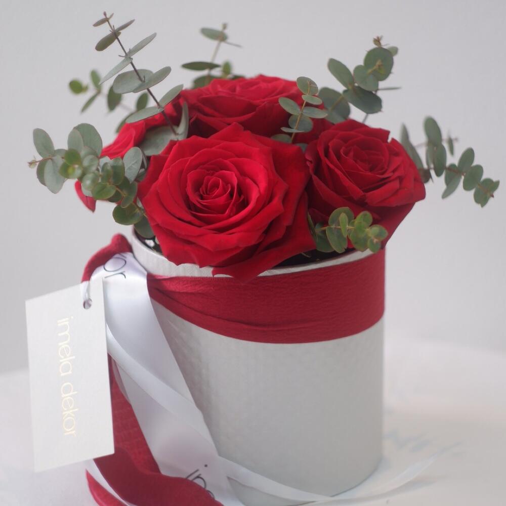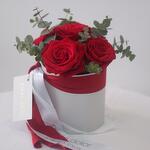 An elegant arrangement of fresh red roses and eucalyptus in a stylish white box, tied with a satin ribbon. The timeless beauty of red roses, combined with the freshness of eucalyptus, makes this box arrangement a sophisticated and romantic gift for any occasion.