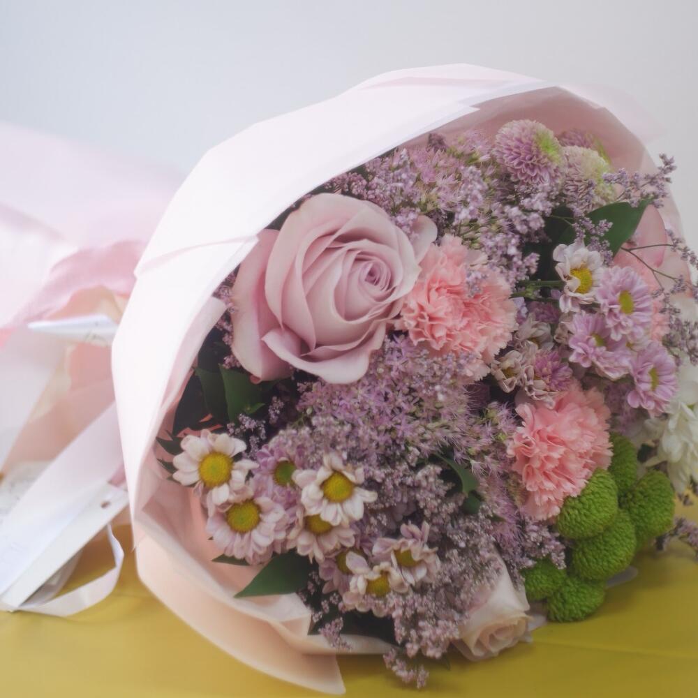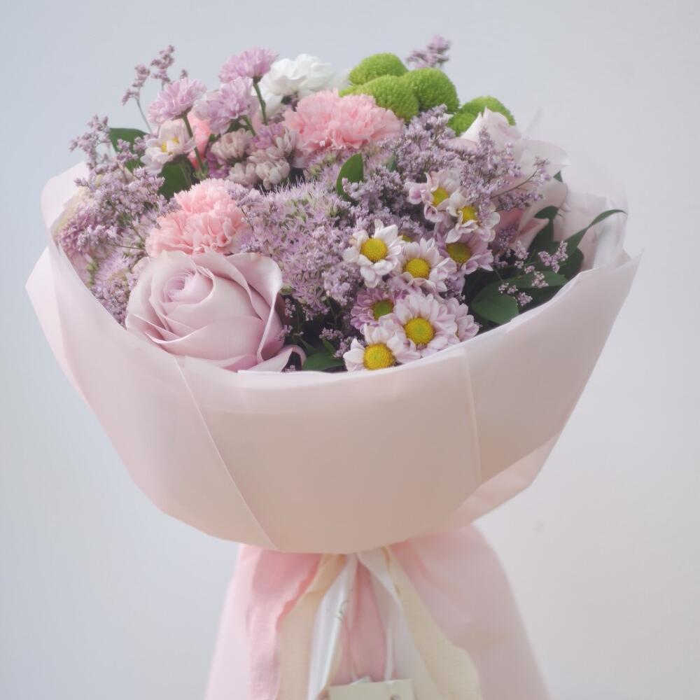 A soft and romantic arrangement featuring elegant roses, cheerful chrysanthemums, delicate carnations, and airy limonium. Wrapped in pastel pink tones, this bouquet radiates tenderness and charm, making it the perfect gift for birthdays, anniversaries, or any special occasion where you want to express love and affection.