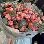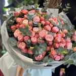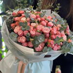 Нежный, воздушный и очень стильный букет, составленный из пышных розовых кустовых роз и ароматного эвкалипта. Богатая фактура бутонов и свежая зелень создают эффект объёмной, живой композиции, которая притягивает взгляды и передаёт тепло самых искренних чувств. Этот букет подходит для дня рождения, сюрприза любимой, благодарности, поздравления коллег или особого торжества. Он универсален, элегантен и всегда смотрится дорого. кустовые розы, розовый букет, букет с эвкалиптом, нежный букет, цветы в оформлении, подарок девушке, свежие розы, красивый букет, композиция из роз, Flowwow подарок, романтичный букет, стильный букет.