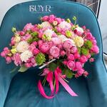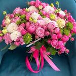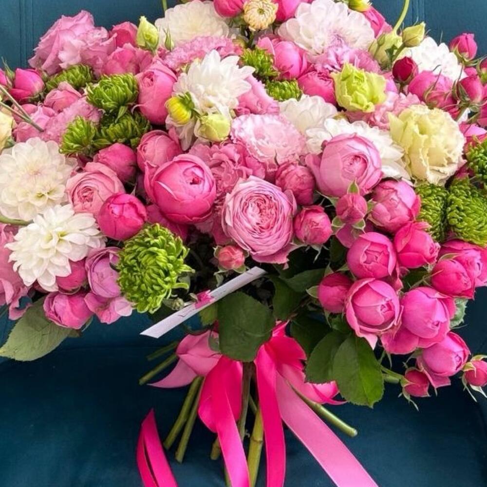 Роскошный букет в нежно-розовой гамме — сочетание пионовидных роз, эустом, белоснежных георгин и ярко-зеленых акцентов. Создан для того, чтобы дарить радость и восхищение. Этот букет идеально подойдет для признания в любви, поздравления с особым событием или просто чтобы порадовать близкого человека. Украшен стильной атласной лентой. Размер: средний/крупный Доставка день в день