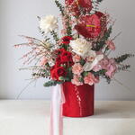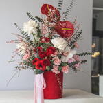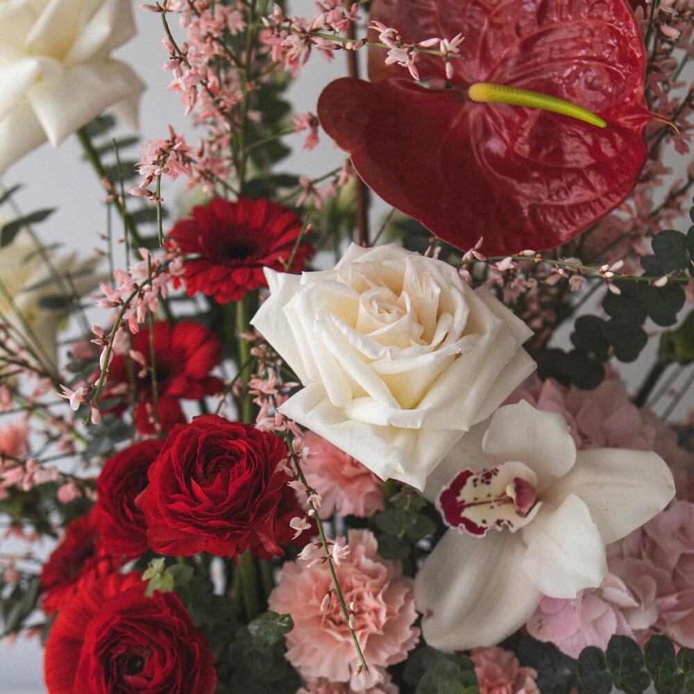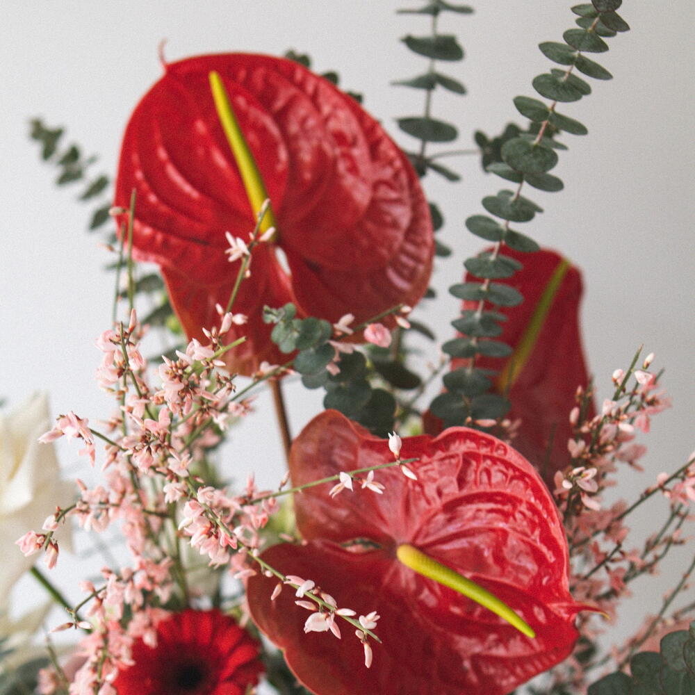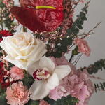Szalag - 3 db. Eustoma - 1 db. eukaliptusz - 4 db. hortenzia - 1 db. germini - 5 db. szegfű - 6 db. ranunkulusz - 3 db. genista - 3 db. anturium - 3 db. mattiola - 2 db. zimbidium - 1 db. ohara rózsa - 3 db.