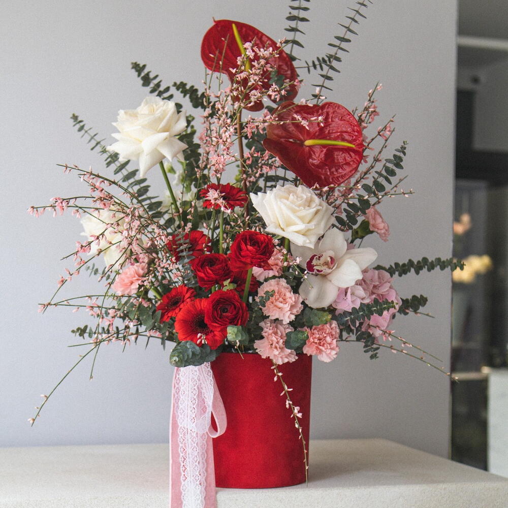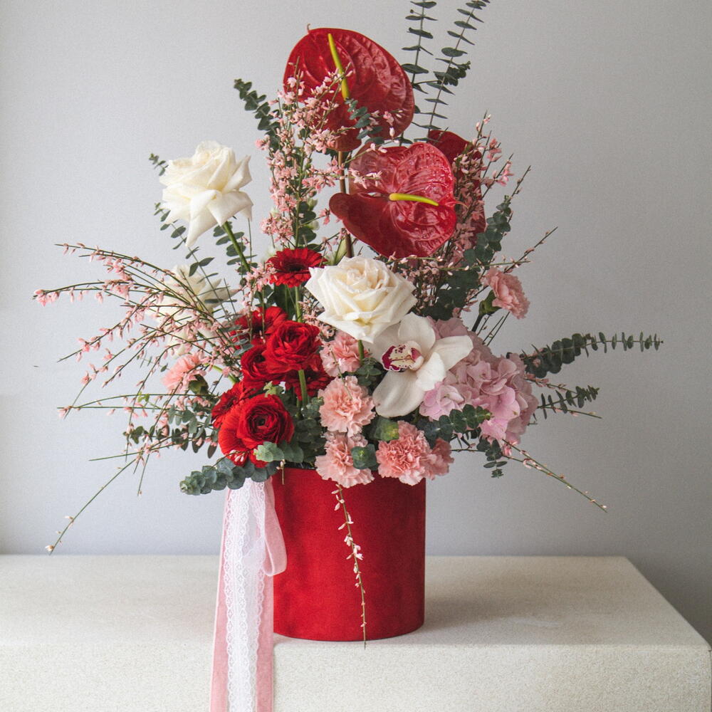 A luxurious floral arrangement in a velvet hatbox with fragrant roses. The perfect wow-effect gift with fast delivery in Belgrade.