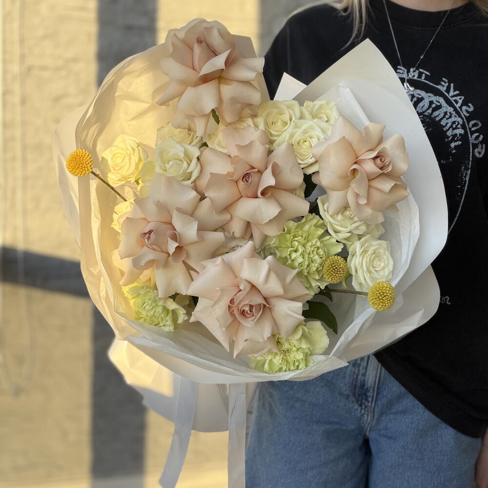 Kényeztesd magad Virágkötői Különlegességeink vibráló energiájával ezzel a kivételes válogatással. 3 éteri Craspedia vibráló ragyogásában pompázik, 3 piruló bokros rózsa kíséretében, ezt a virágkompozíciót 5 elbűvölő francia rózsa teszi még vonzóbbá. 3 dianthus zölddel kiegészítve ez a csokor olyan frissességet áraszt, amely életet lehel bármilyen helyiségbe. Gyönyörűen elrendezett, ez a válogatás a természet tagadhatatlan szépségének fenséges kifejeződése.