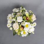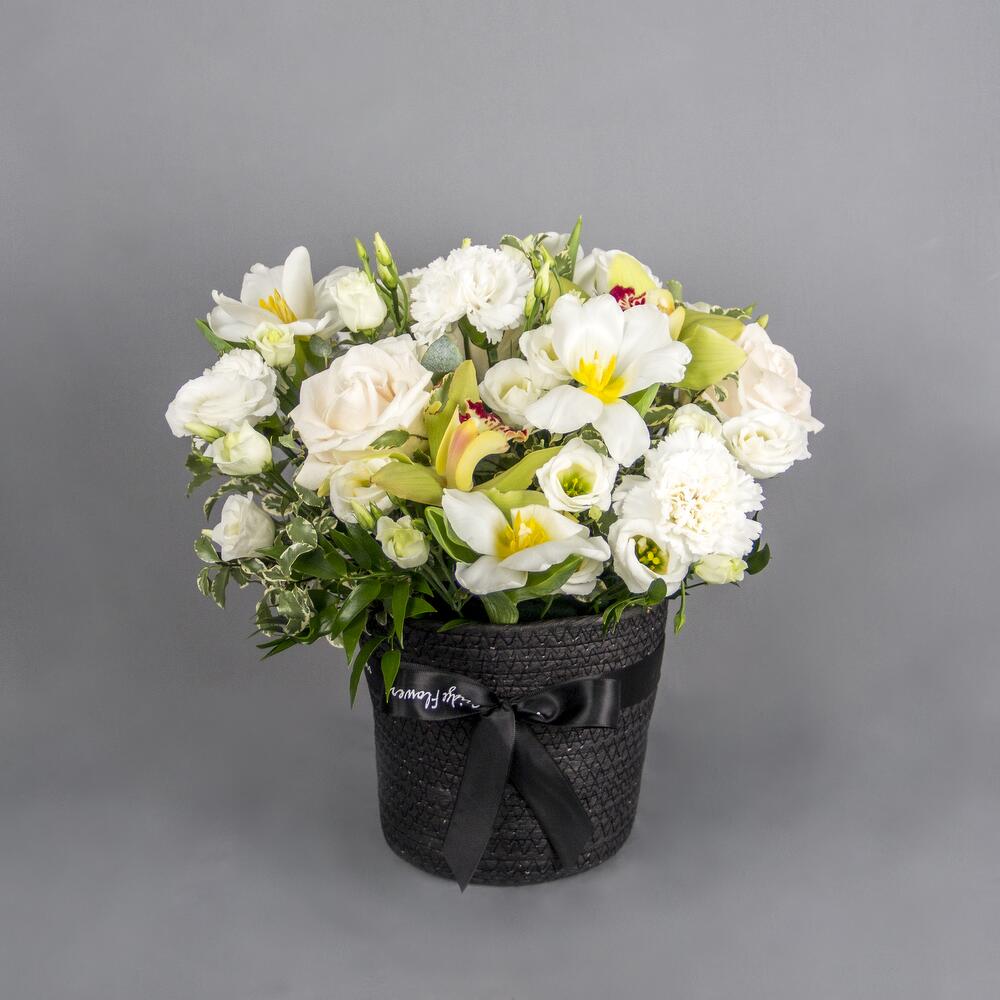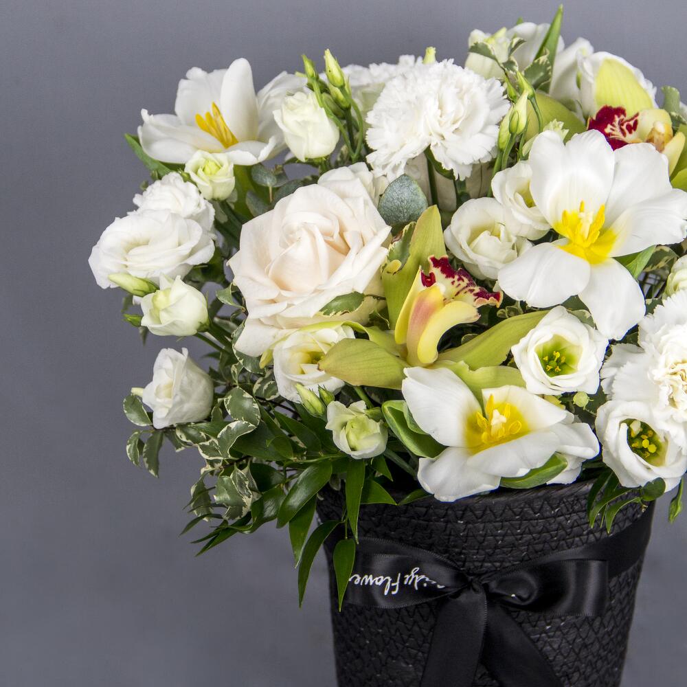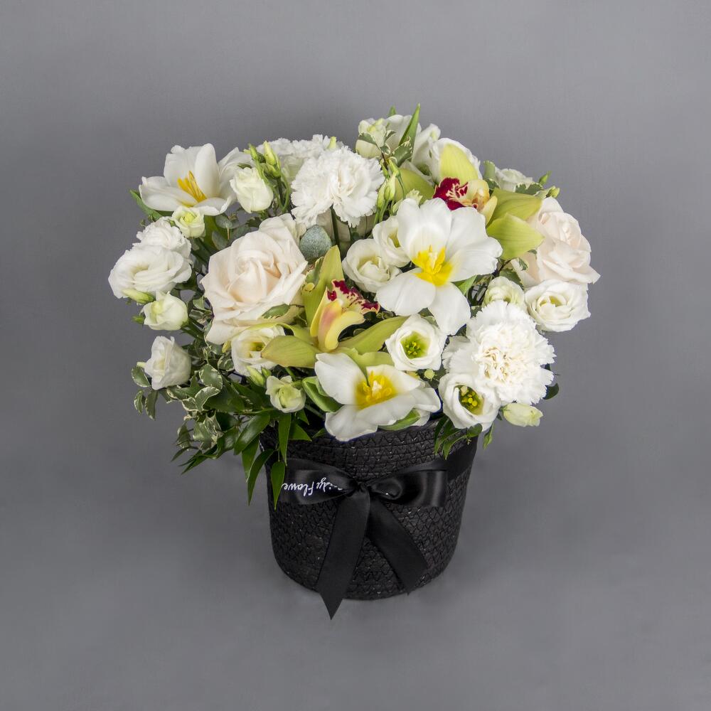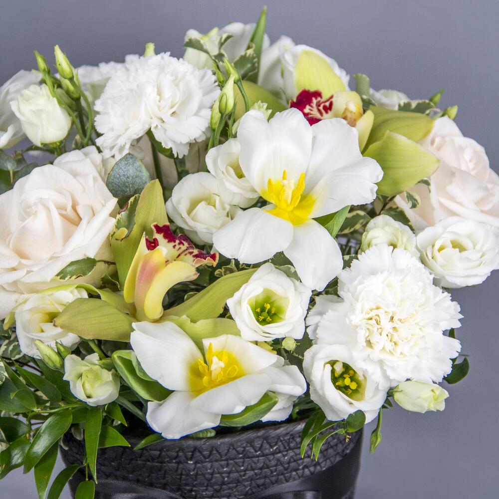 A basket arrangement contains of white roses, Eustoma, white tulips, green cymbidium orchid and green leaves.