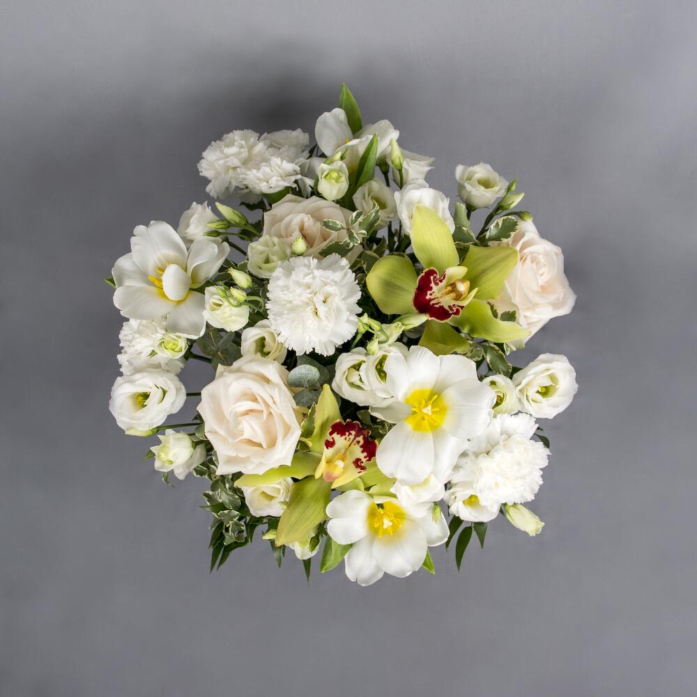 Eustoma - 5 db. Tulipánok - 4 db. rózsa - 4 db. szegfű - 4 db. cymbidium - 2 db.