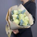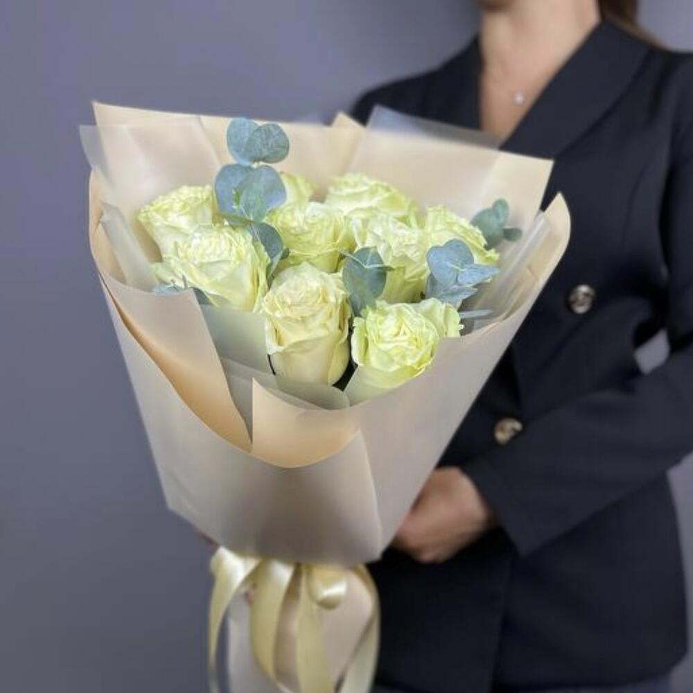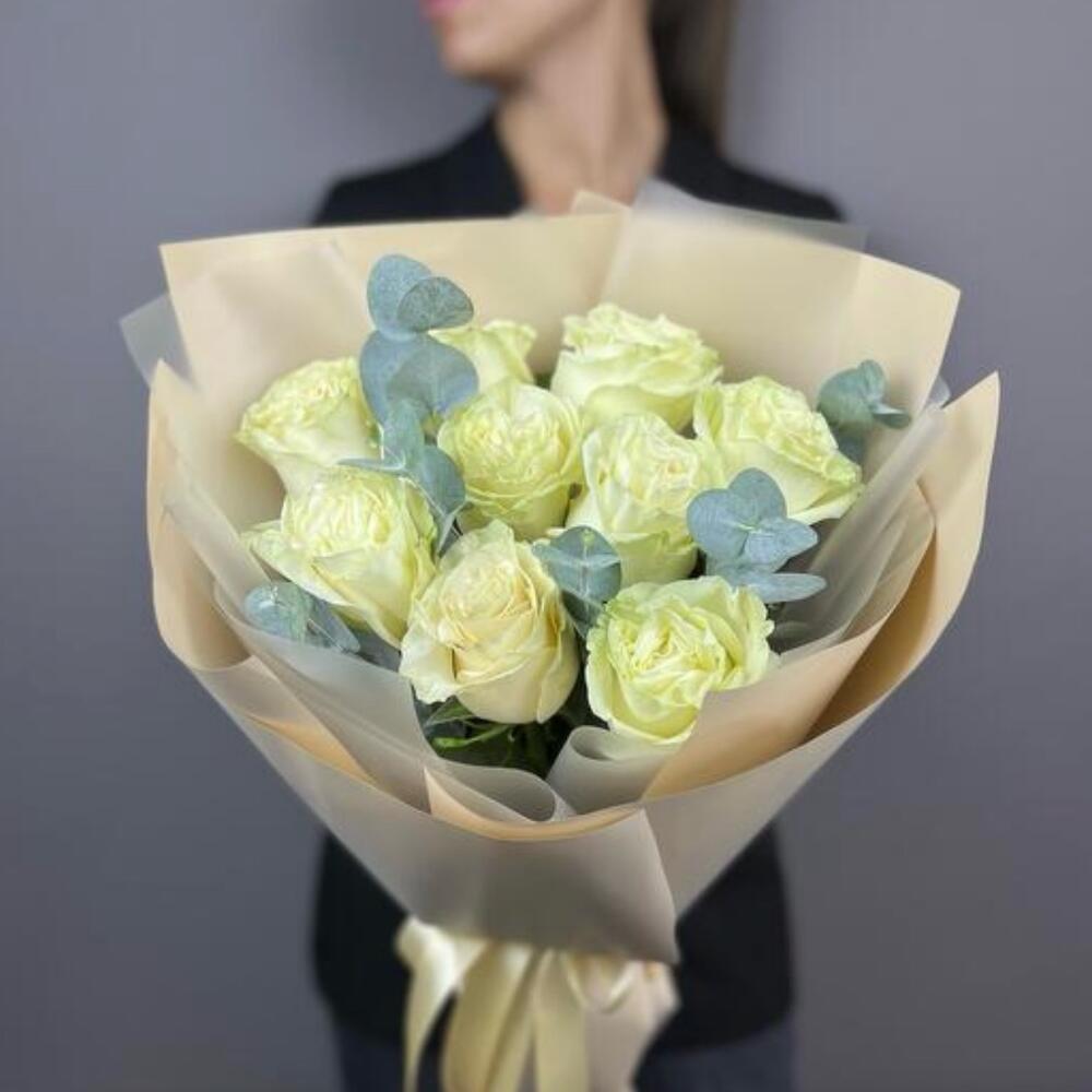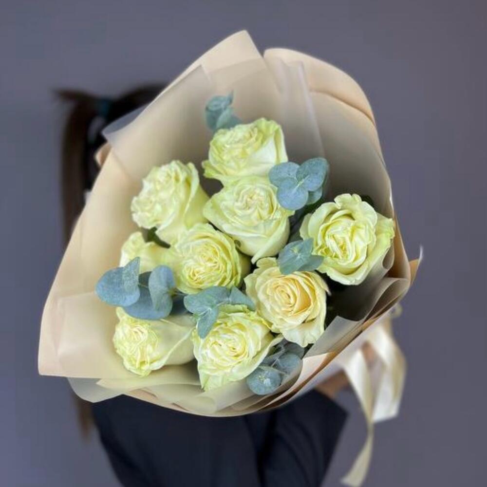 Eukaliptusz - 3 db. Szatén szalag - 1 db. A csomagolás tervező - 3 db. белая эквадорская роза 60 см - 9 db.