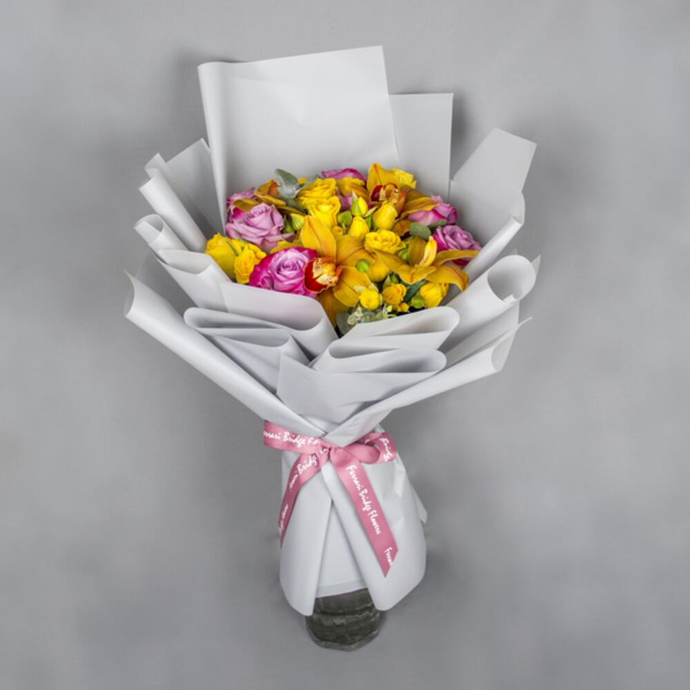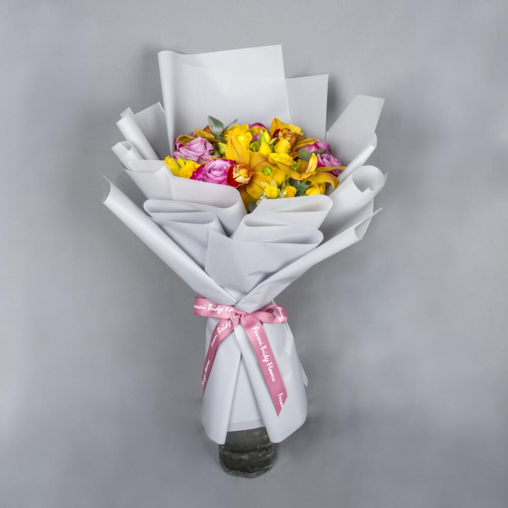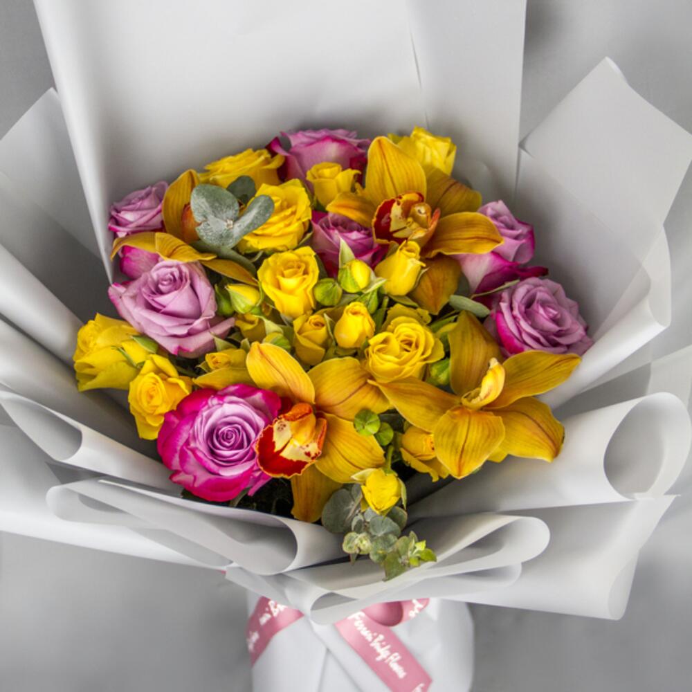 A hand bouquet of yellow spray roses, purple roses and yellow cymbidium orchids