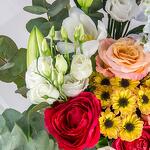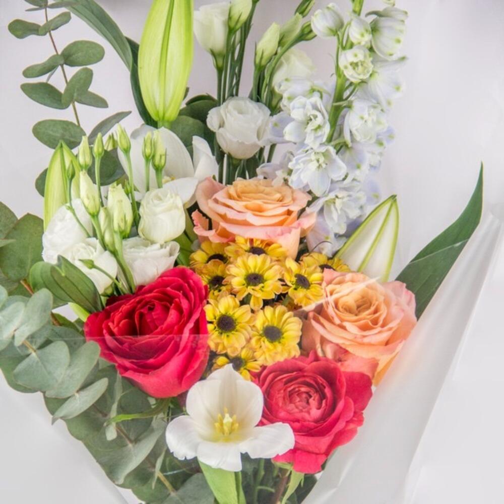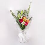 A stunning mix of colorful roses, lilies, and vibrant filler flowers, wrapped and ready to delight.