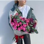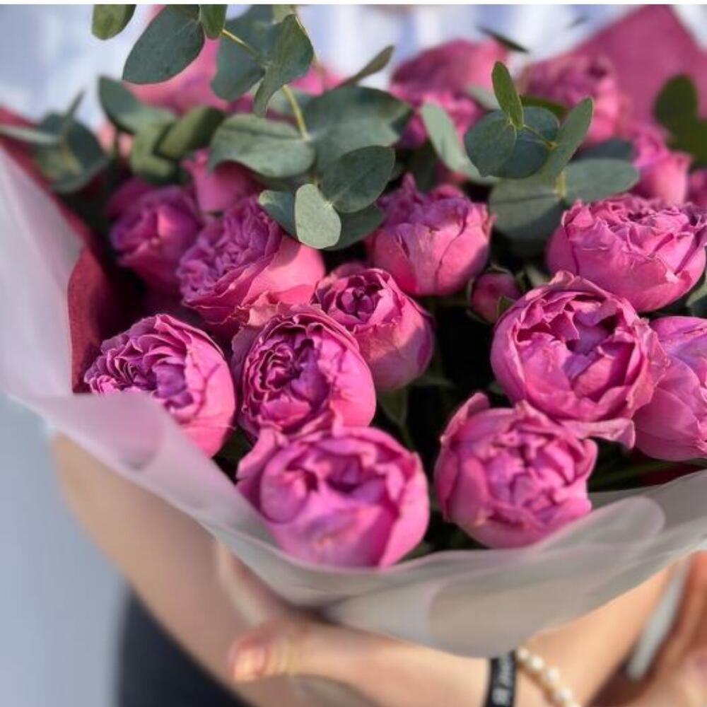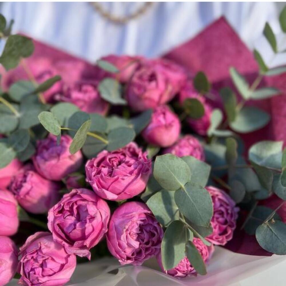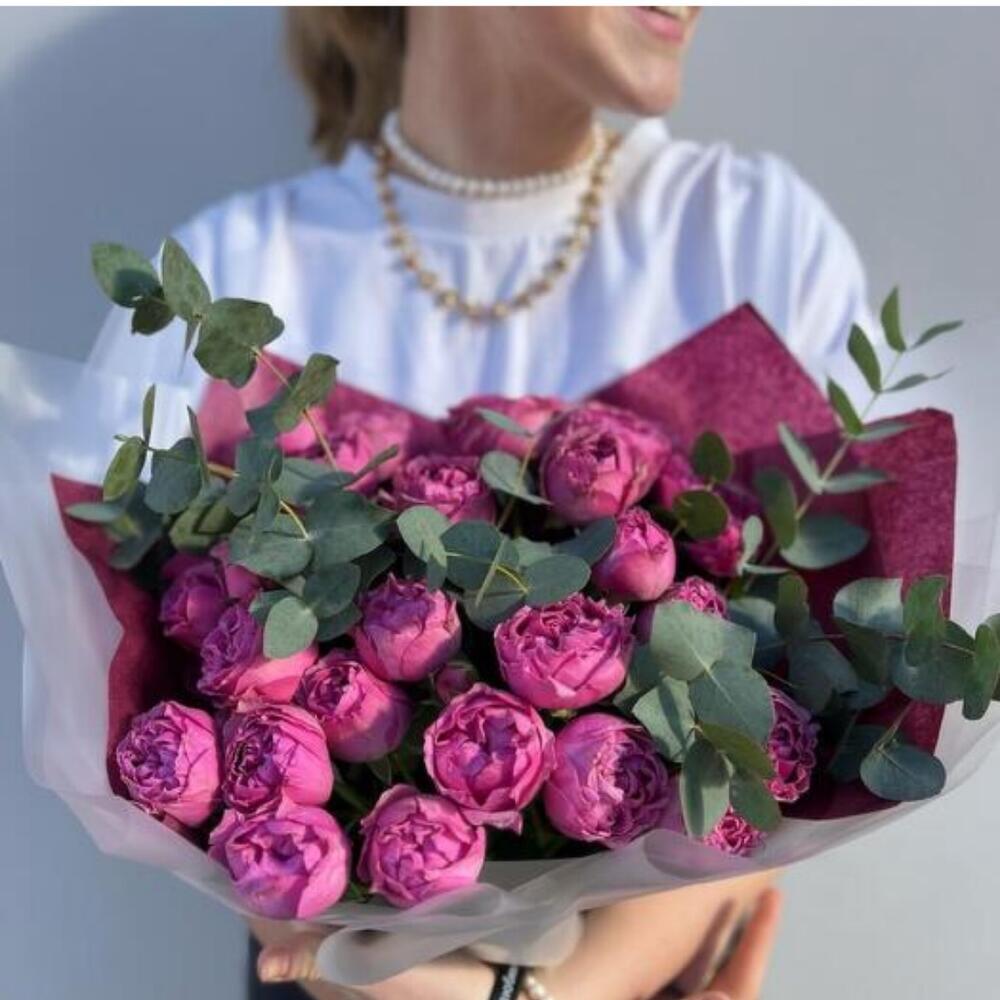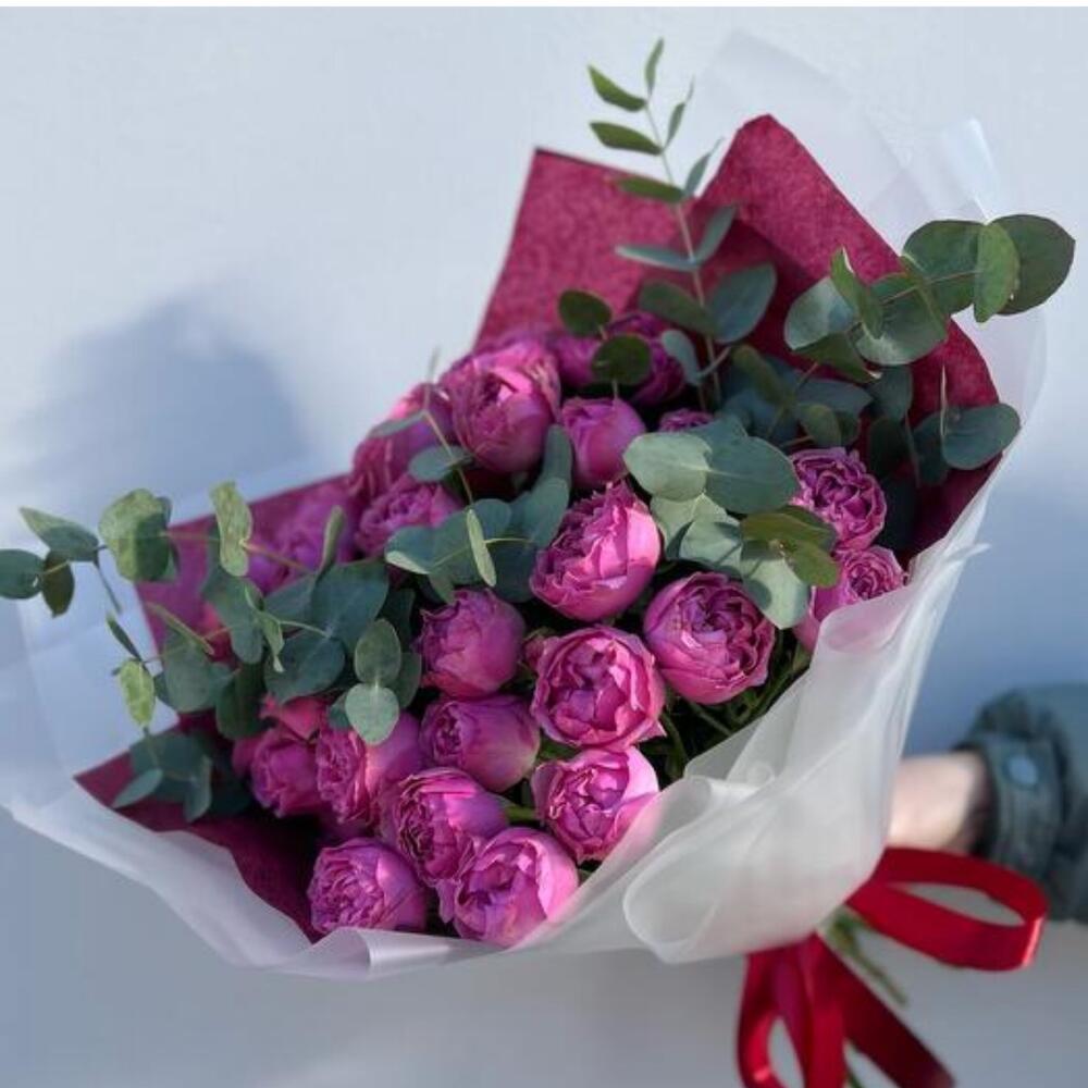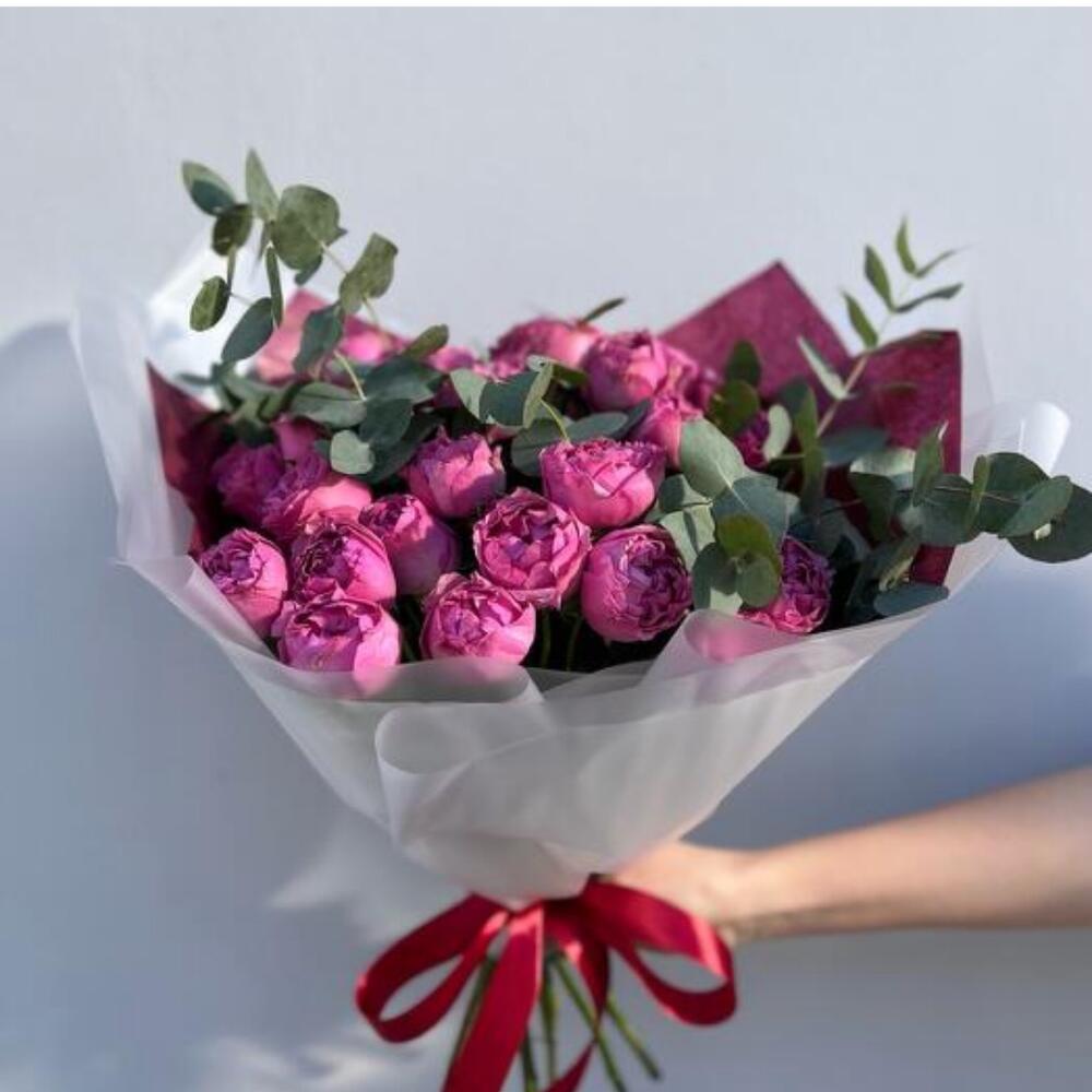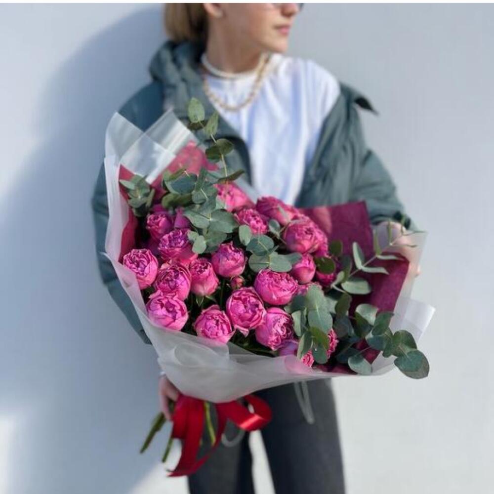 Эффектный букет, составленный из пышных пионовидных роз насыщенного розового оттенка в сочетании с веточками эвкалипта. Нежная и в то же время выразительная композиция, подходящая для особых случаев и для того, чтобы просто поднять настроение близкому человеку. Упаковка в белых и бордовых тонах подчеркивает элегантность букета и его стильное оформление