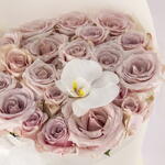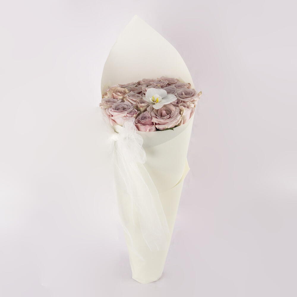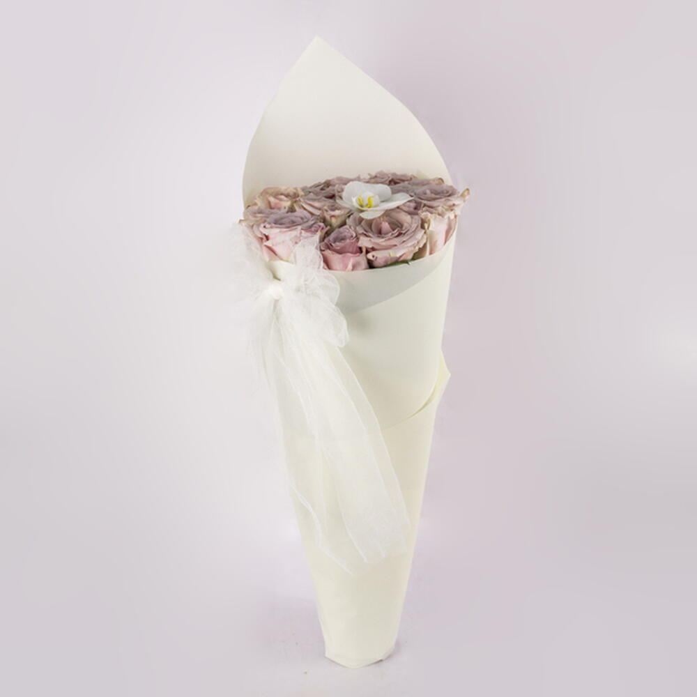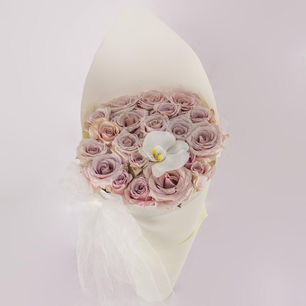 A delicate and elegant bouquet featuring a collection of beautiful mauve roses, exquisitely complemented by a single pristine white orchid and wrapped in a soft, ethereal tulle.