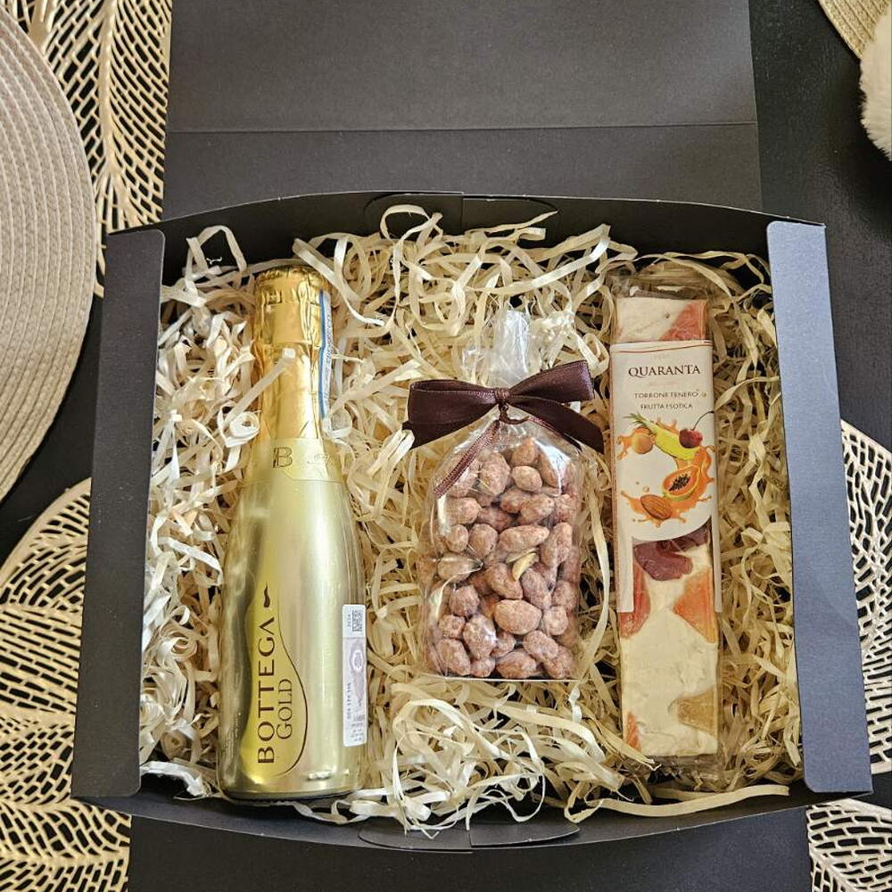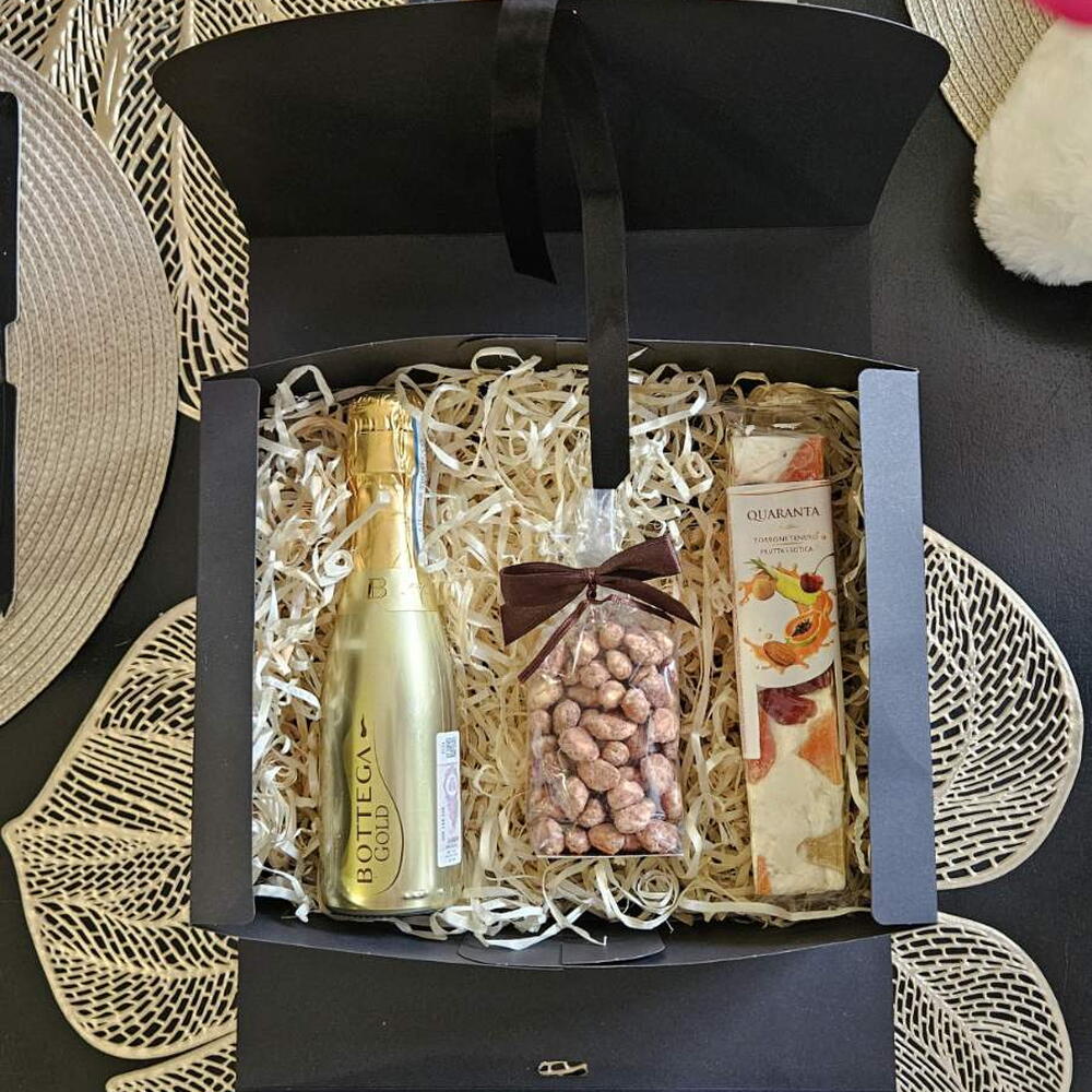 Ez az elegáns ajándékkészlet, mélyfekete matt kartondobozba csomagolva és selymes fekete szalaggal átkötve, tökéletes ajándék különleges alkalmakra. A készlet tartalma: 🍾 Egy üveg finom pezsgő vagy likőr – a szép pillanatok megünneplésére. 🍬 Finom nugát tejszínnel és gyümölcsökkel – bársonyos olasz édesség egy csipetnyi kifinomultsággal. 🥜 Válogatott diófélék – ropogós nassolnivaló természetes ízzel. Ez az ajándék nemcsak tartalmával, hanem formájával is elbűvölő – tökéletes azok számára, akik értékelik az ízt, az esztétikát és az eleganciát.