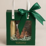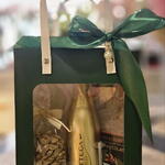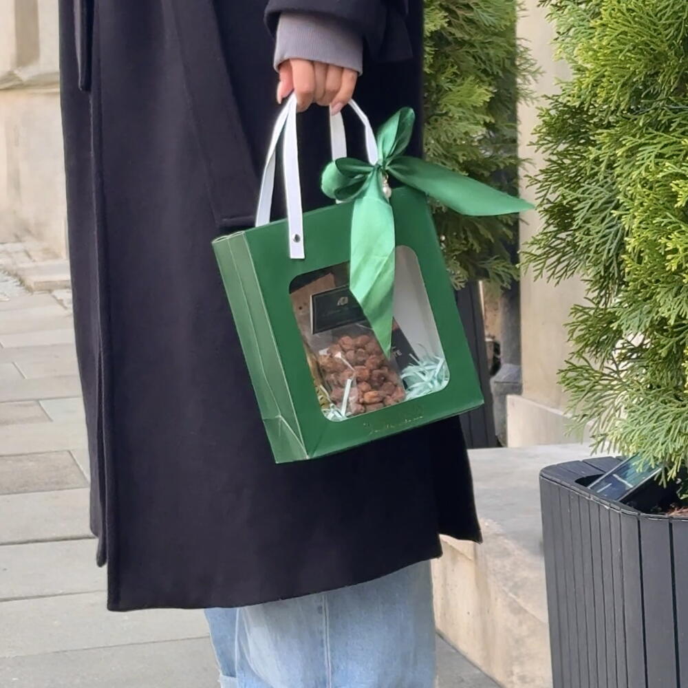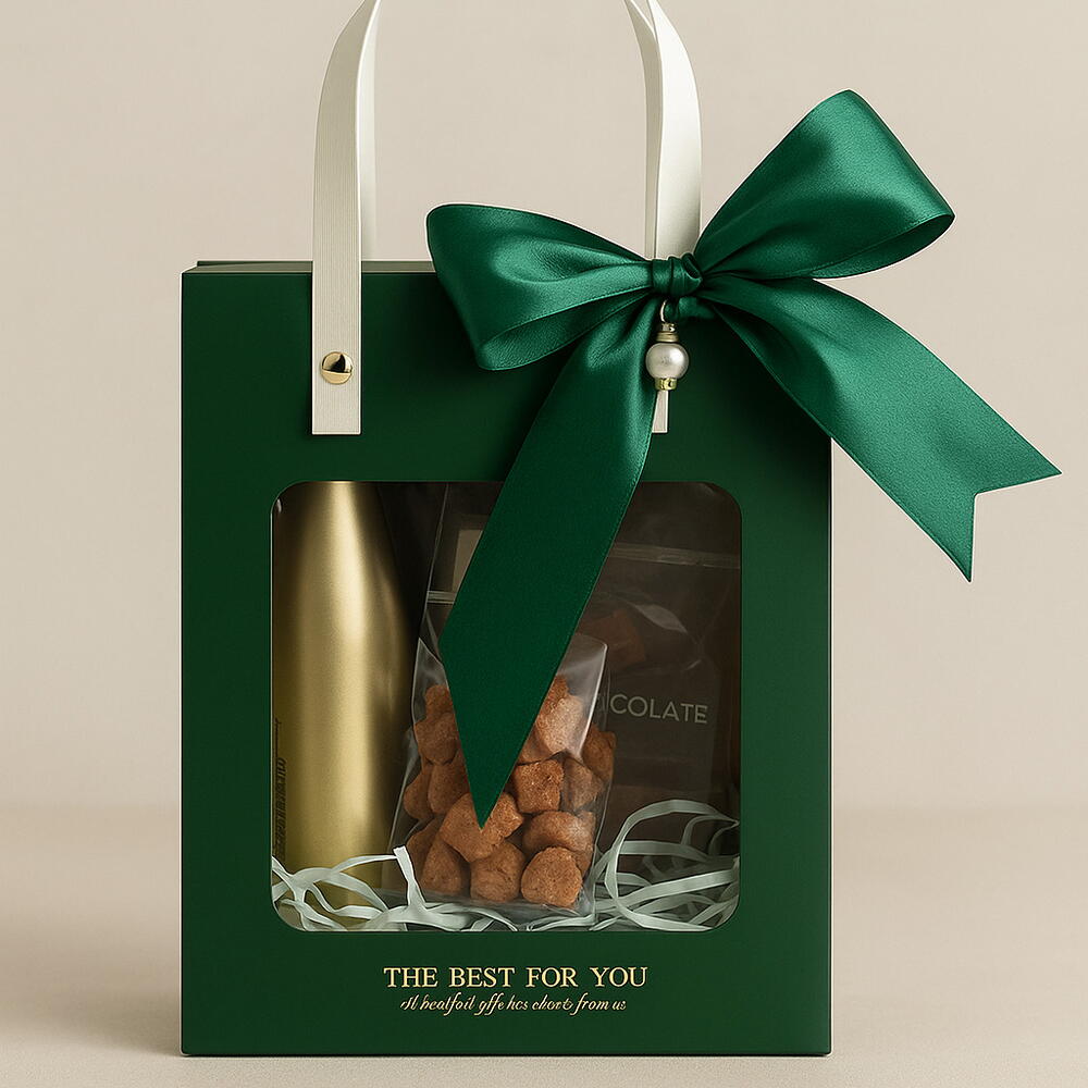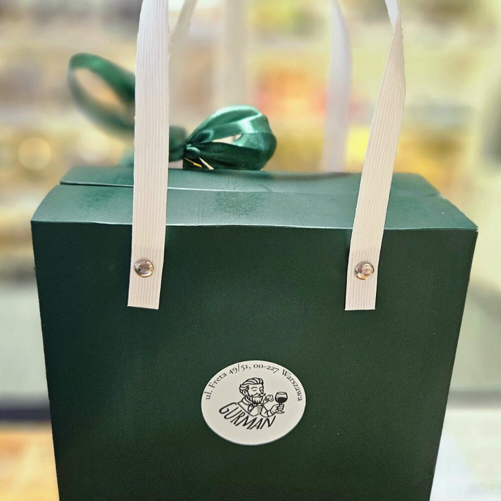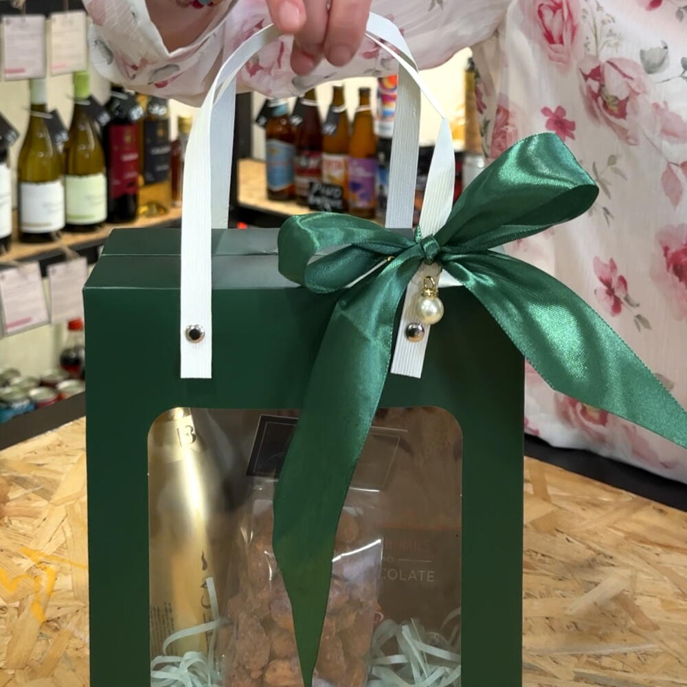 Elegancki, a zarazem prosty prezent, składający się z butelki szampana/likieru 200 ml, orzeszków oraz belgijskiej czekolady. Całość zapakowana jest w zieloną torebkę prezentową, zamykaną od góry, ozdobioną zieloną kokardką i sztuczną perełką.