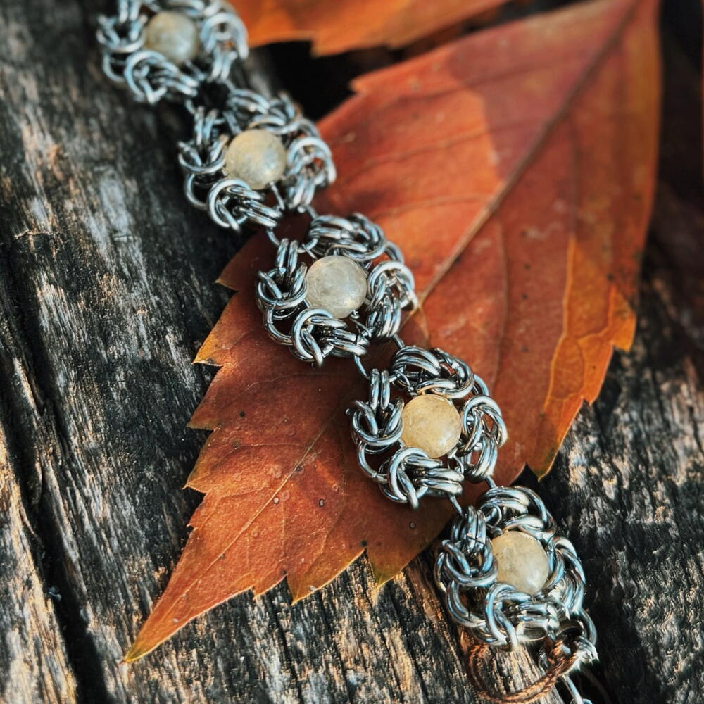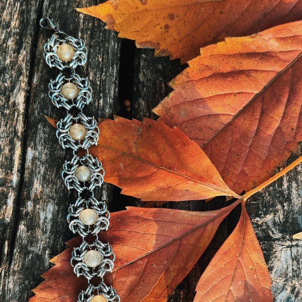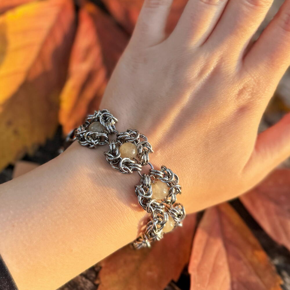 Браслет кольчужного плетения с цитринами. Тяжелый, прочный, очень приятно сидит на руке. || Оклопна наруквица са цитринима. Тешка, издржљива и веома удобна на зглобу.