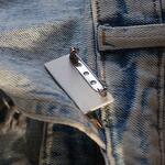 Handmade of natural clay ceramic badge with Russian text Душнила