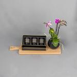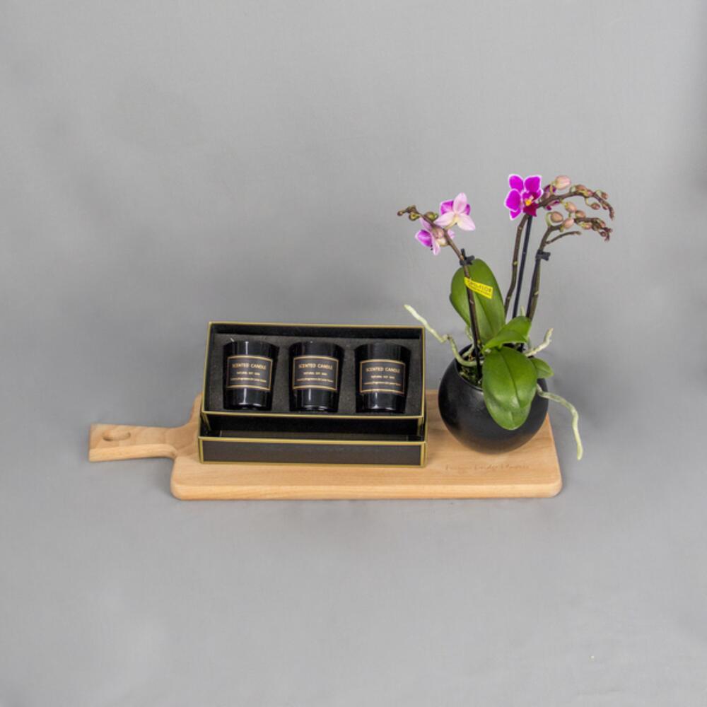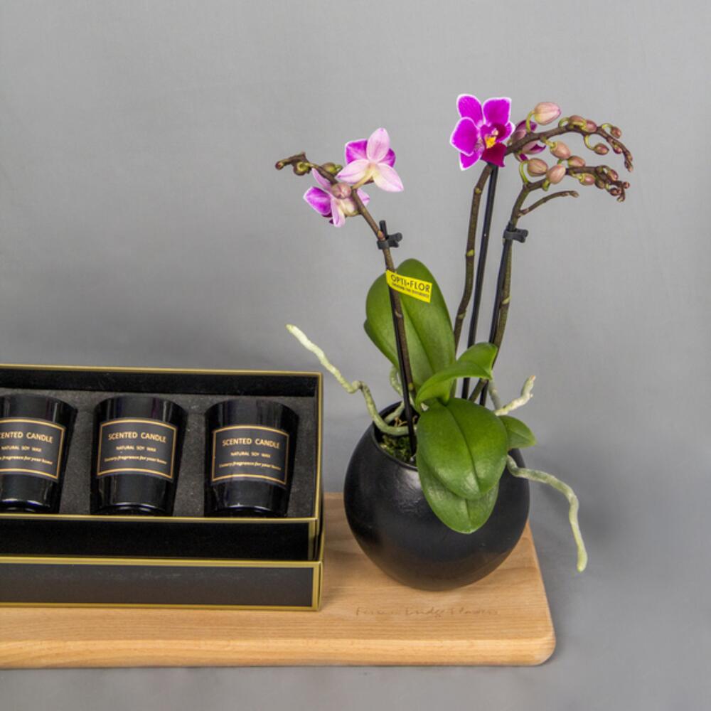 A longlasting gift arrangement of a luxurious scented candle set with a mini orchid plant.