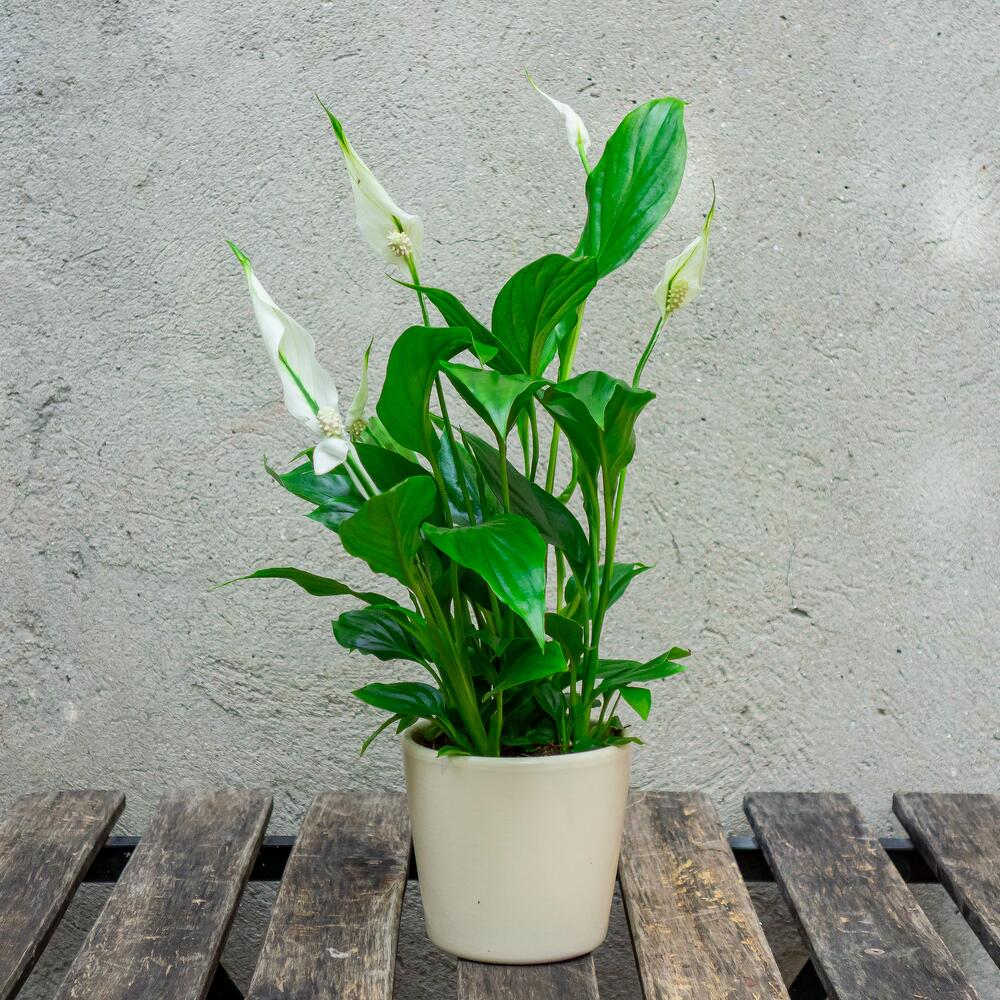 A small Spathiphyllum, commonly known as a Peace Lily, in a pot is a lovely addition to any space. This compact plant is known for its elegant, glossy green leaves and its striking white flowers that bloom periodically. Peace Lilies thrive in low to moderate light and appreciate a bit of humidity. They’re easy to care for—just keep the soil moist but not soggy, and they’ll reward you with their air-purifying qualities and beauty. A small Spathiphyllum is perfect for a desk, shelf, or any corner that needs a touch of greenery.