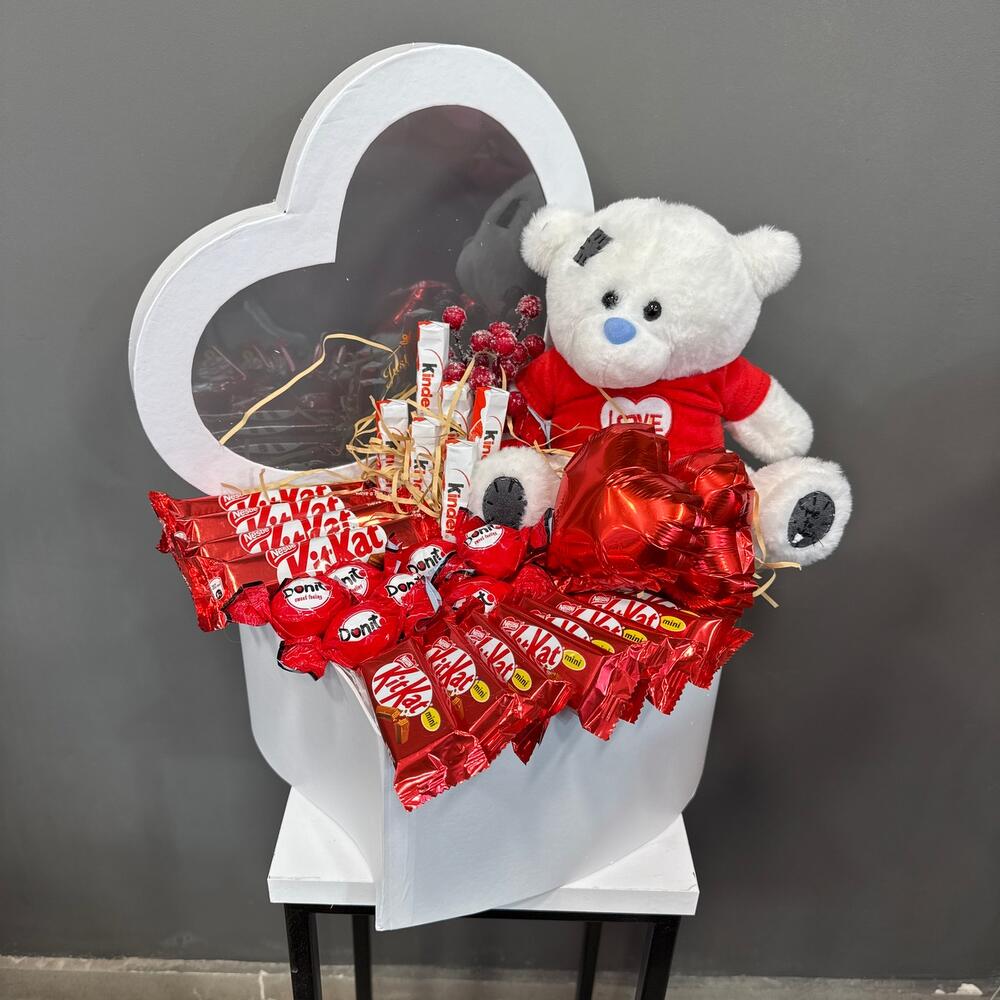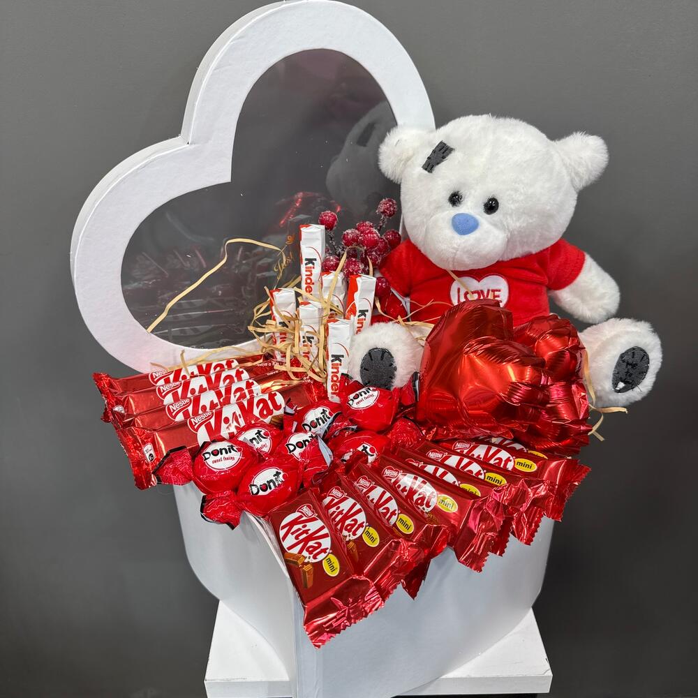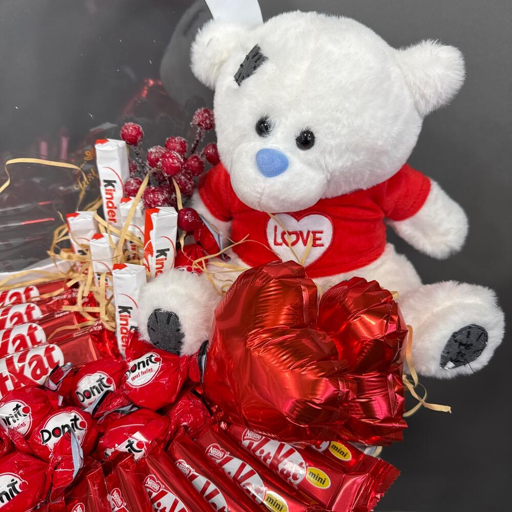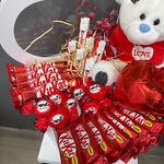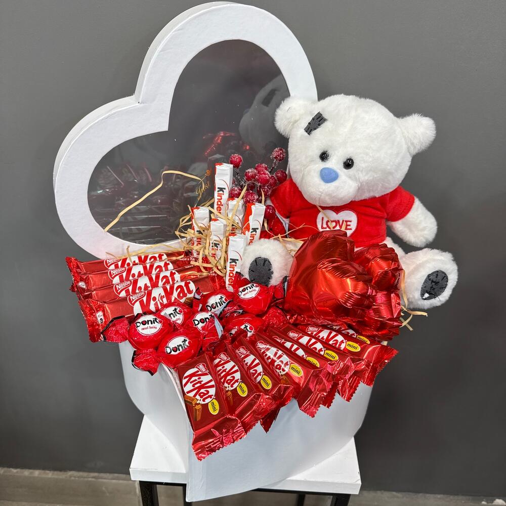 КитКат - 4 db. Коробка сердце - 1 db. Киндер шоколад - 6 db. Шар фольгированный - 2 db. тедди - 1 db. кит кат мини - 8 db. донит конфет - 8 db.