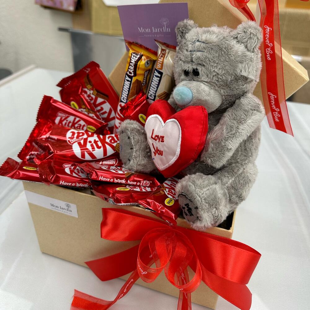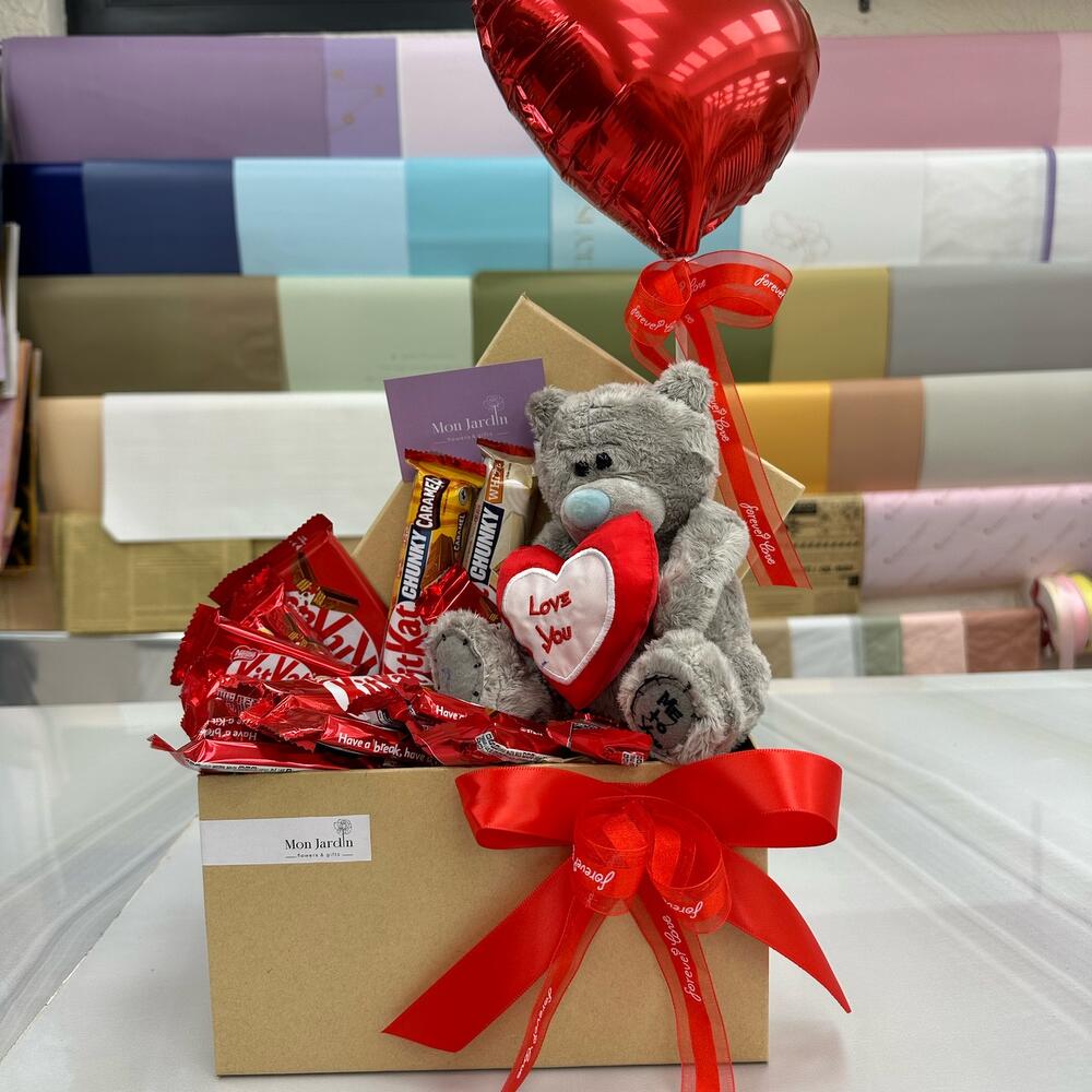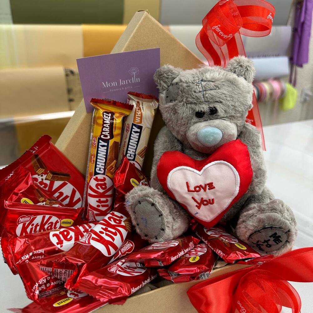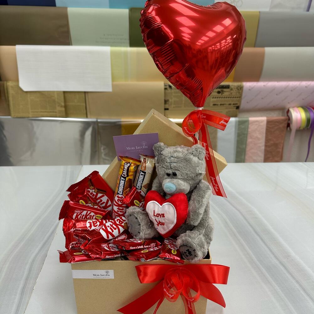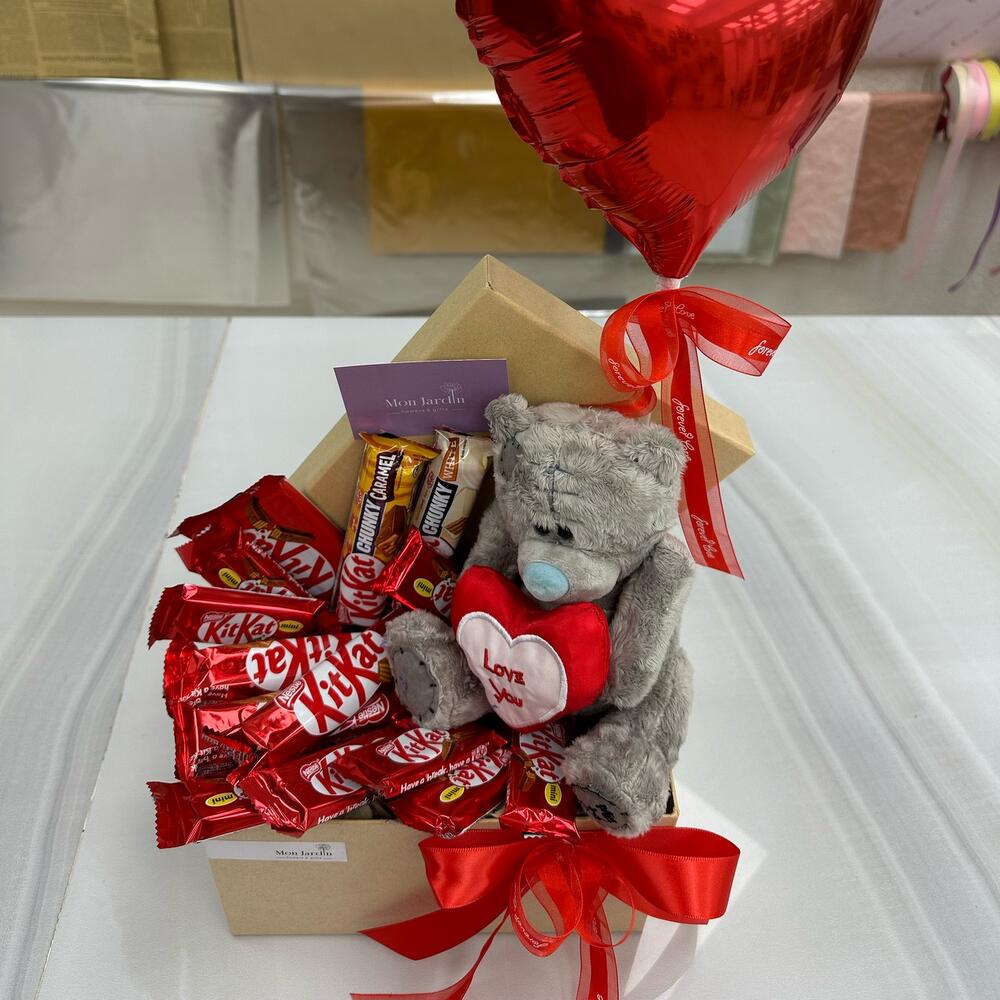 Szatén szalag - 1 db. Коробка - 1 db. Мишка плюшевый - 1 db. Воздушный шар - 1 db. кит кат шоколад - 14 db.