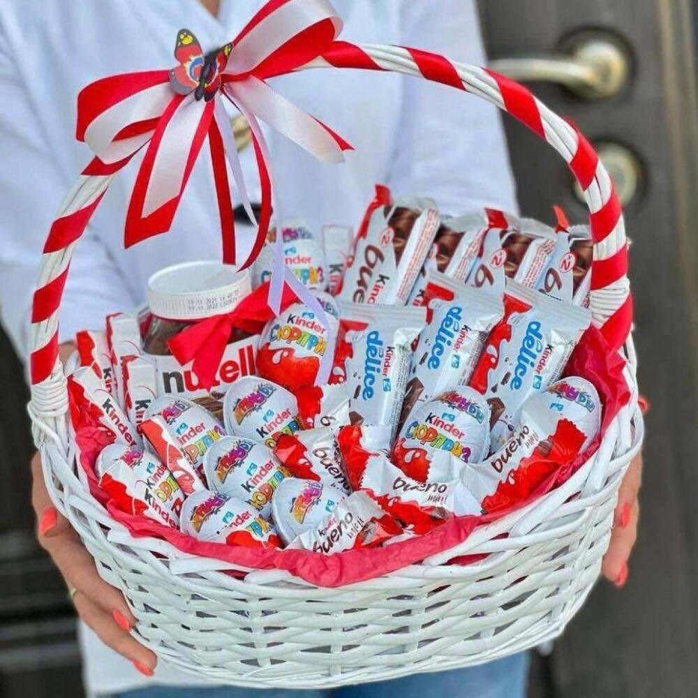 Подарочная корзина «Киндер сюрприз». Целая коллекция всеми любимого шоколада Kinder. Вкусное ассорти киндер сладостей оценят все без исключения. Шоколадные лакомства красиво выложены в плетеную корзину, украшенную яркой атласной лентой с бантом.