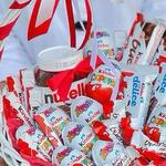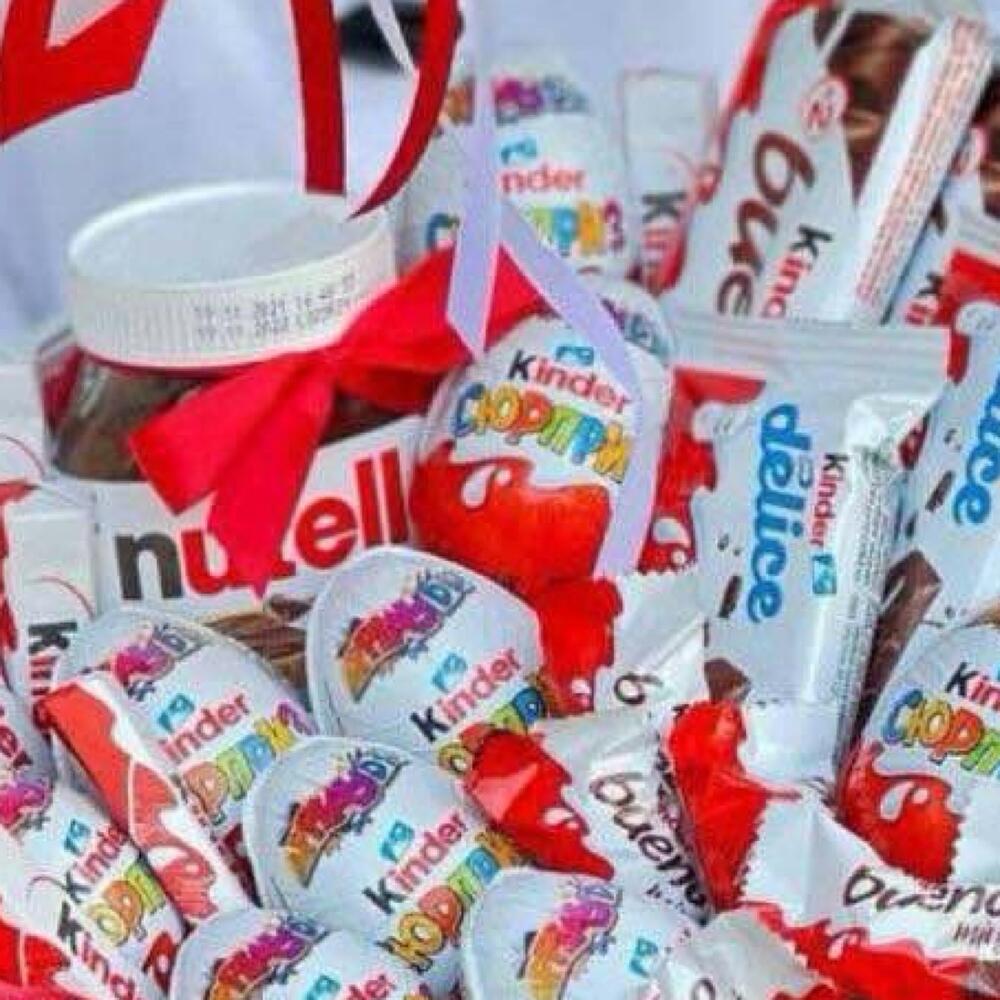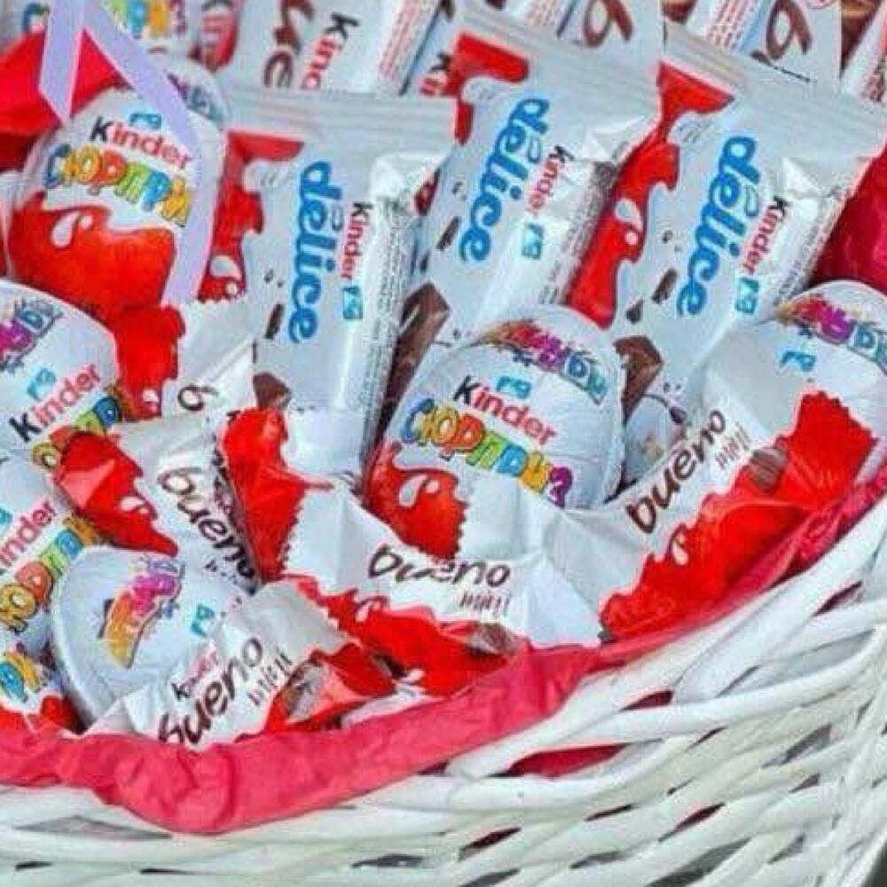 Szatén szalag - 1 db. Киндер сюрприз - 10 db. Fonott kosár - 1 db. Киндер шоколад - 10 db. Нутелла - 1 db. Киндер Делис - 4 db. Киндер Буэно - 4 db. Калька упаковка - 1 db. мини буэно - 10 db.