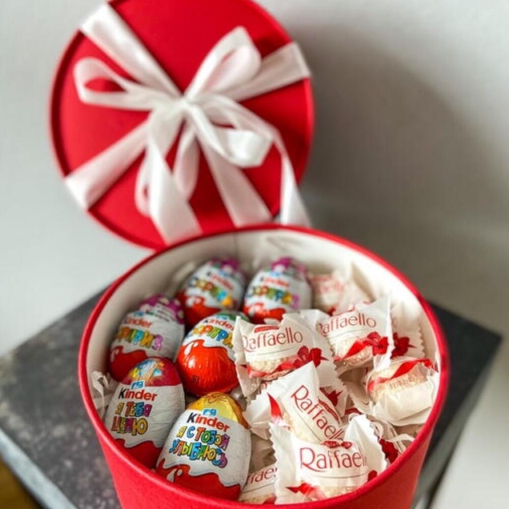 Стильная круглая красная коробка, наполненная любимыми лакомствами: 🍬 Raffaello – нежные кокосовые конфеты 🎊 Kinder Surprise – сладкий сюрприз с игрушкой Отличный выбор для подарка: 💝 14 февраля, День Святого Валентина 🌸 8 марта 🎂 День рождения 🎄 Новый год и Рождество 💑 Годовщина, свидание 👩👧👦 Жене, девушке, маме, сестре, подруге, ребёнку 📍 Доставка по городу | 📦 Самовывоз